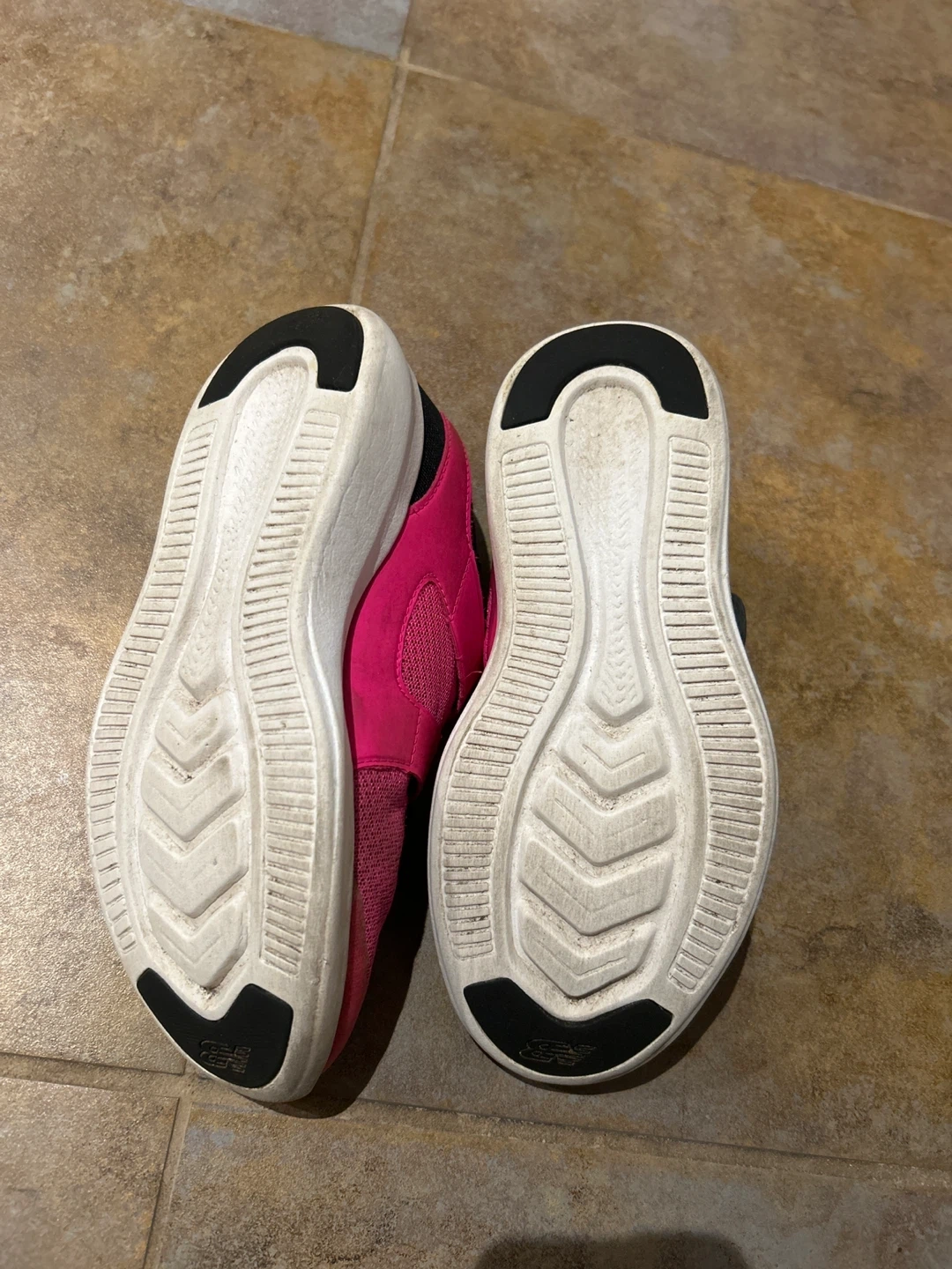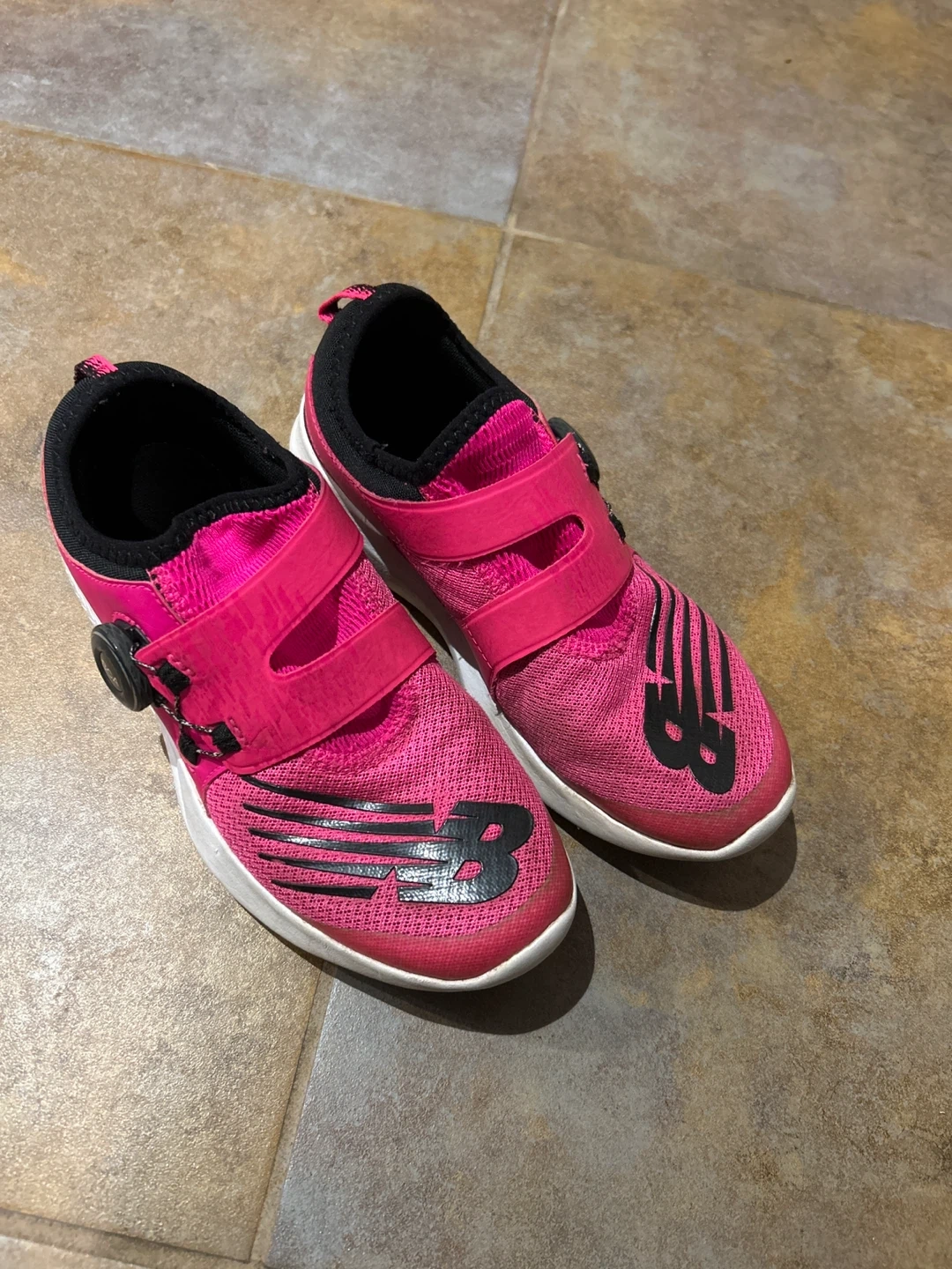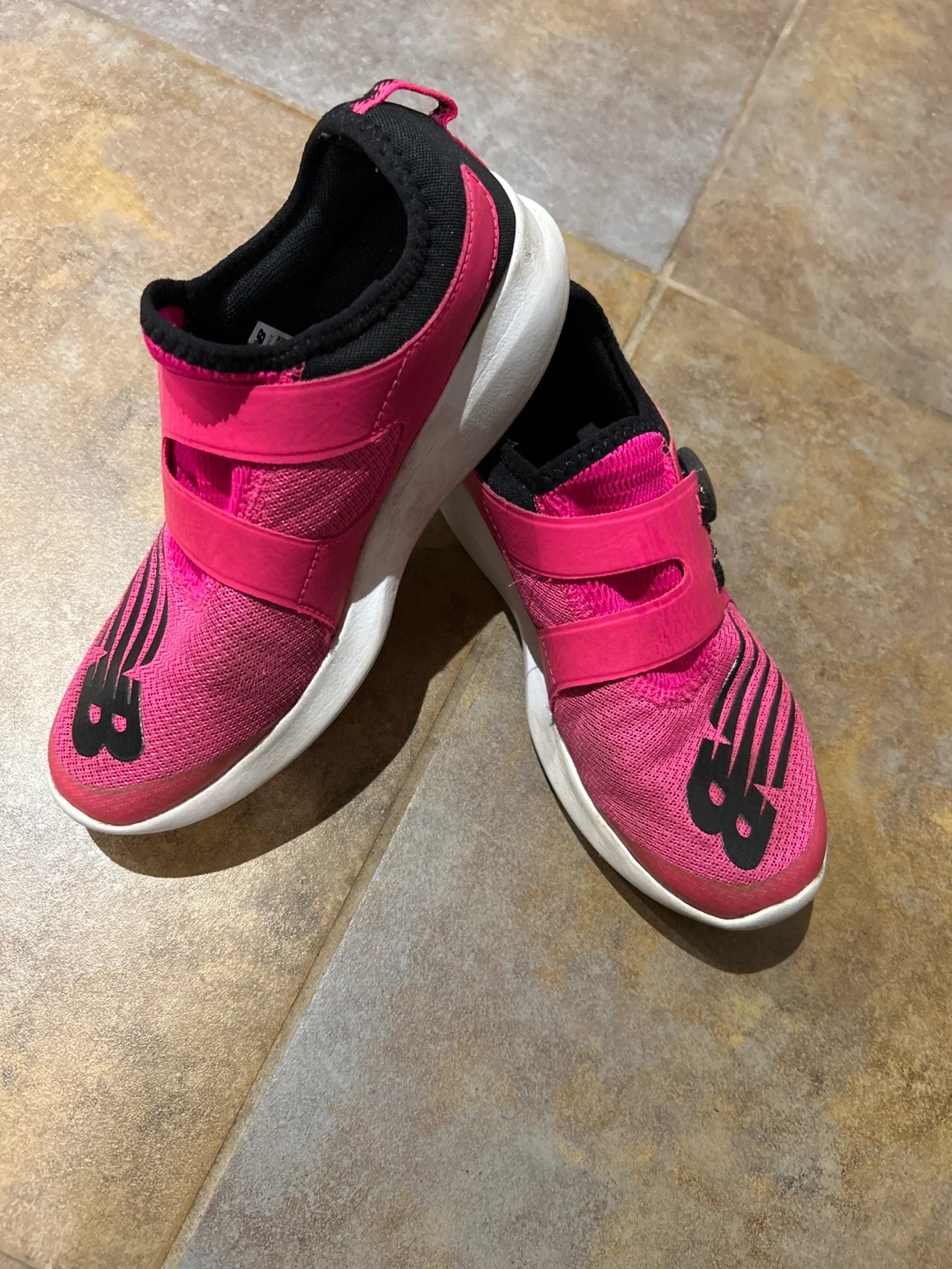These New Balance kids' shoes are in great condition and ready for a new adventure! They're a vibrant pink colour with black accents. Perfect for active kids!