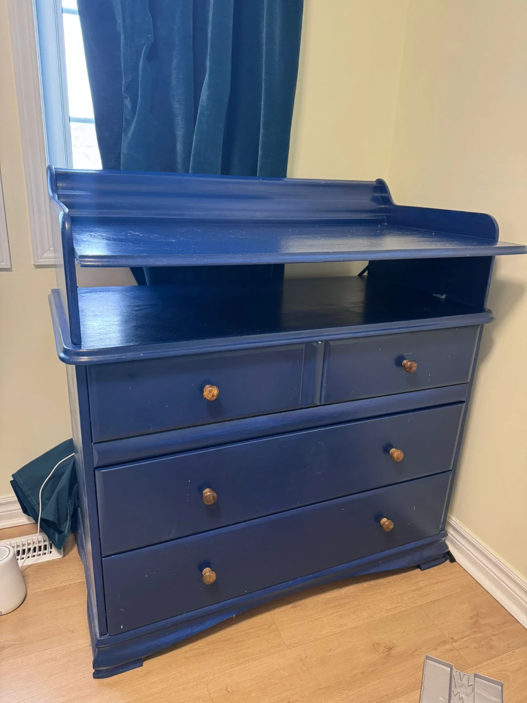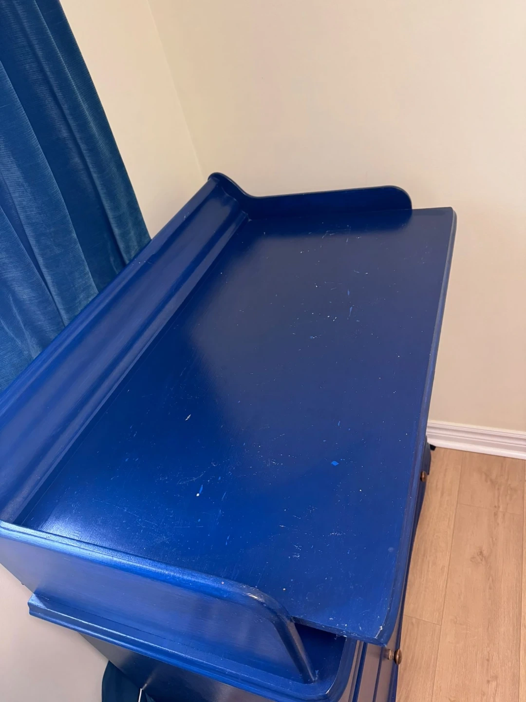 Here's a sturdy blue changing table with drawers! It's perfect for keeping baby essentials organized and close at hand during diaper changes. The changing surface is spacious and secure, and the drawers offer ample storage for diapers, wipes, and other necessities. It's in good condition and ready for a new home