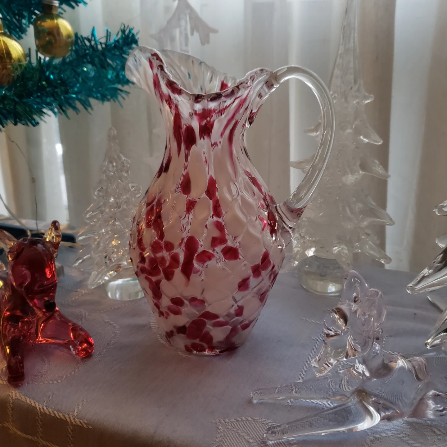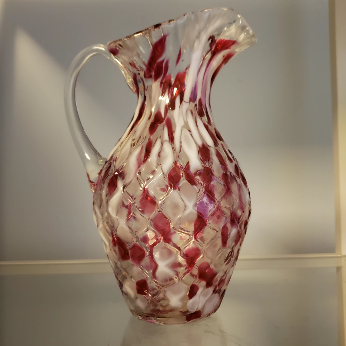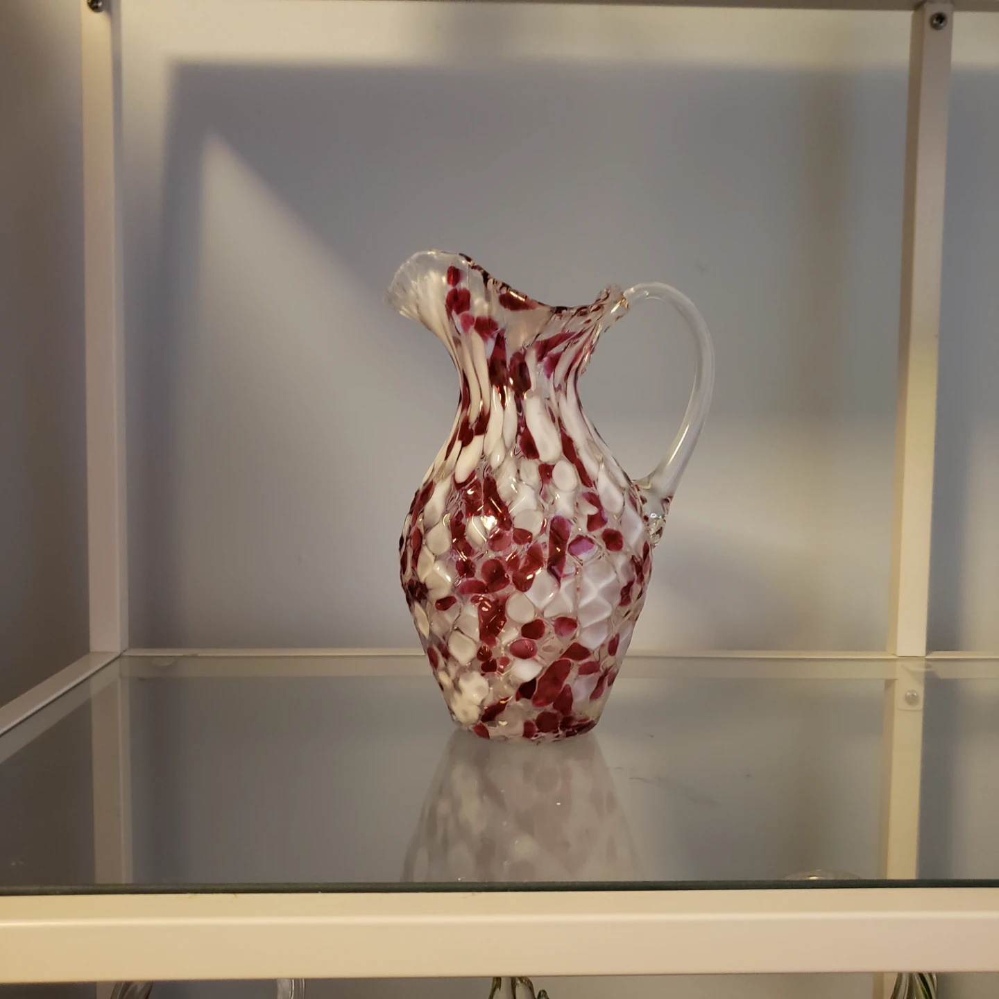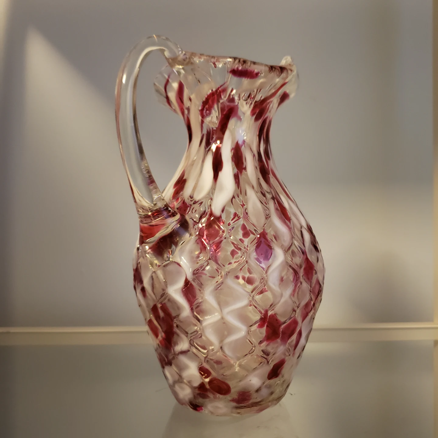 Selling a lovely art glass pitcher with a unique red and white pattern! It's in great condition and would make a beautiful addition to any home. Perfect for serving drinks or displaying as a decorative piece. Made by Chalet Canada end of day pieces. Unique . 8.5" tall