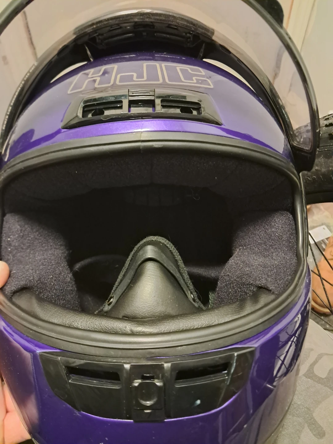 Selling a purple HJC CL-16 snowmobile helmet. It has some signs of wear, but is still in good condition and ready to use. It has a clear visor and a comfortable interior padding. Perfect for anyone looking for a reliable helmet!