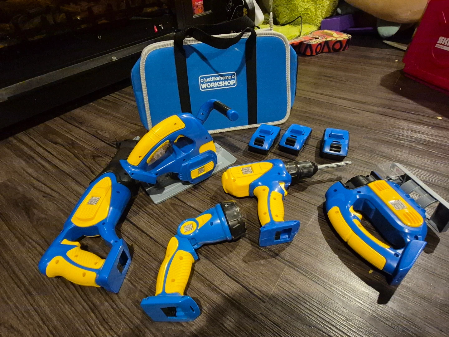 Selling a Just Like Home Workshop tool set! This set comes with a variety of tools in blue and yellow, perfect for little builders. Includes a carrying case to keep everything organized. Great for imaginative play!
