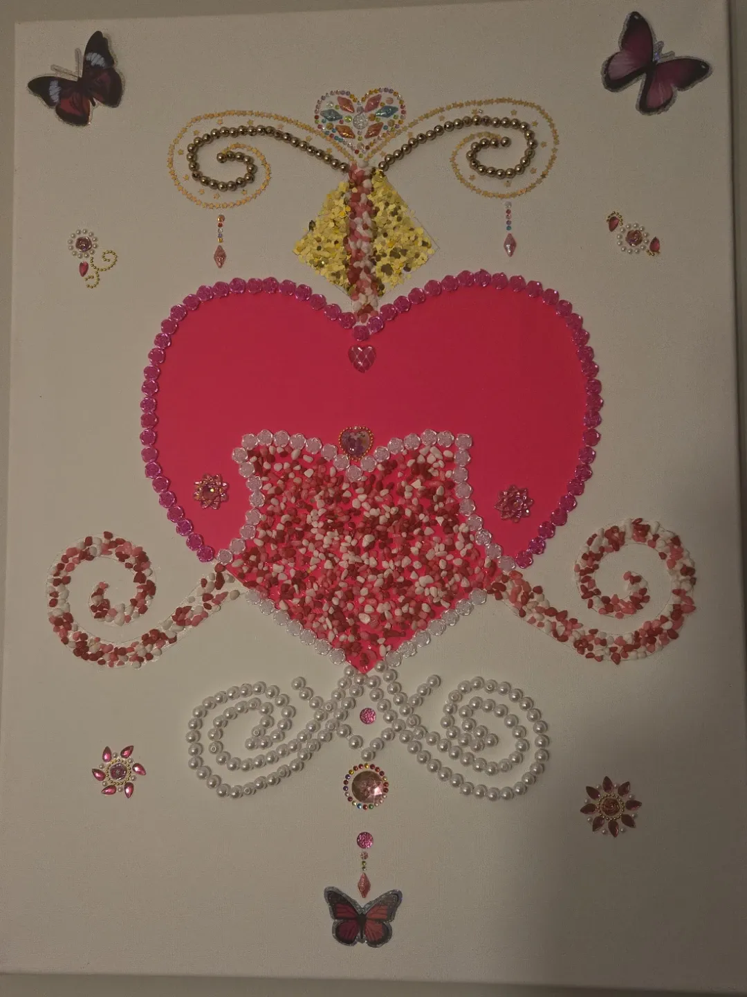 This is a handmade canvas art piece featuring a pink heart design with various embellishments such as beads, pearls, and butterfly accents. It's a unique and eye-catching piece for your home decor!