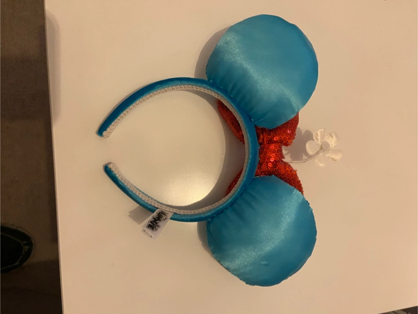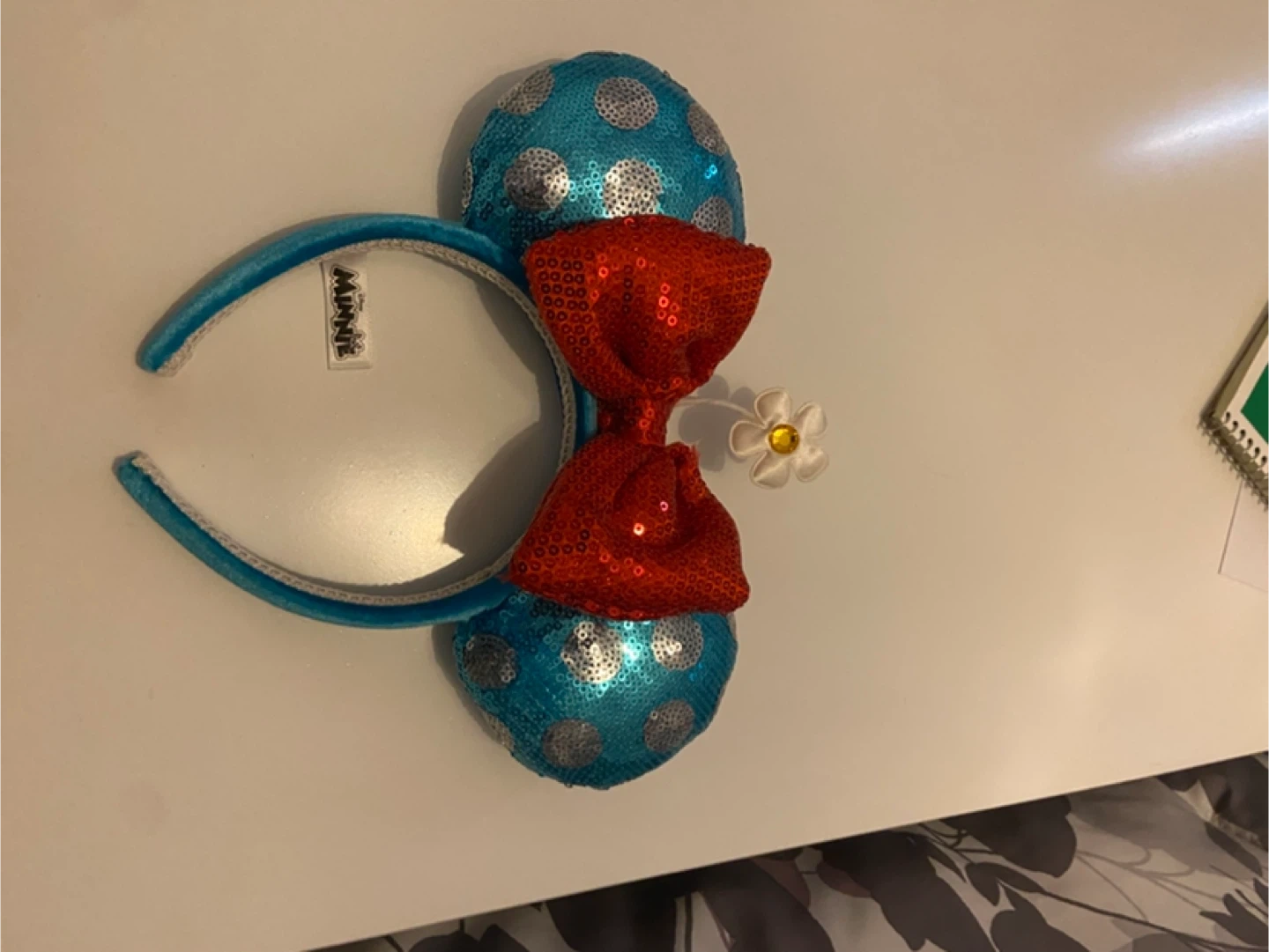 Super cute Minnie Mouse ears headband! Features a red sequin bow and a little white flower. The ears themselves are a sparkly blue with silver polka dots. Perfect for a trip to Disney or just for fun! Never used. Official Disney brand.