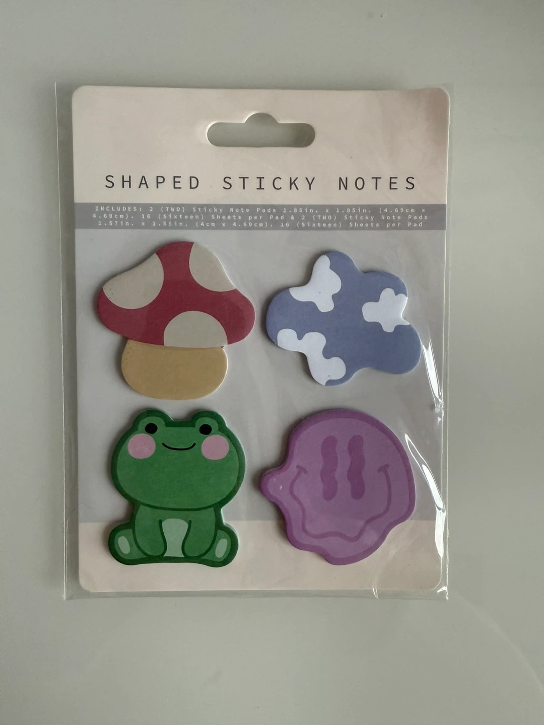 Selling a new pack of shaped sticky notes! Includes two sticky note pads of each design: mushroom, cloud, frog, and smiley face.