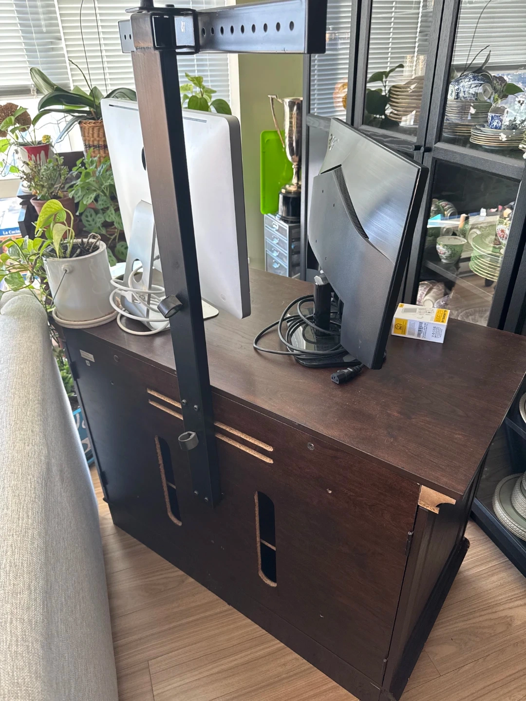 Selling a dark brown wooden TV stand. It features glass doors and open shelving for storage and TV bracket. It's in good condition and ready for a new home!