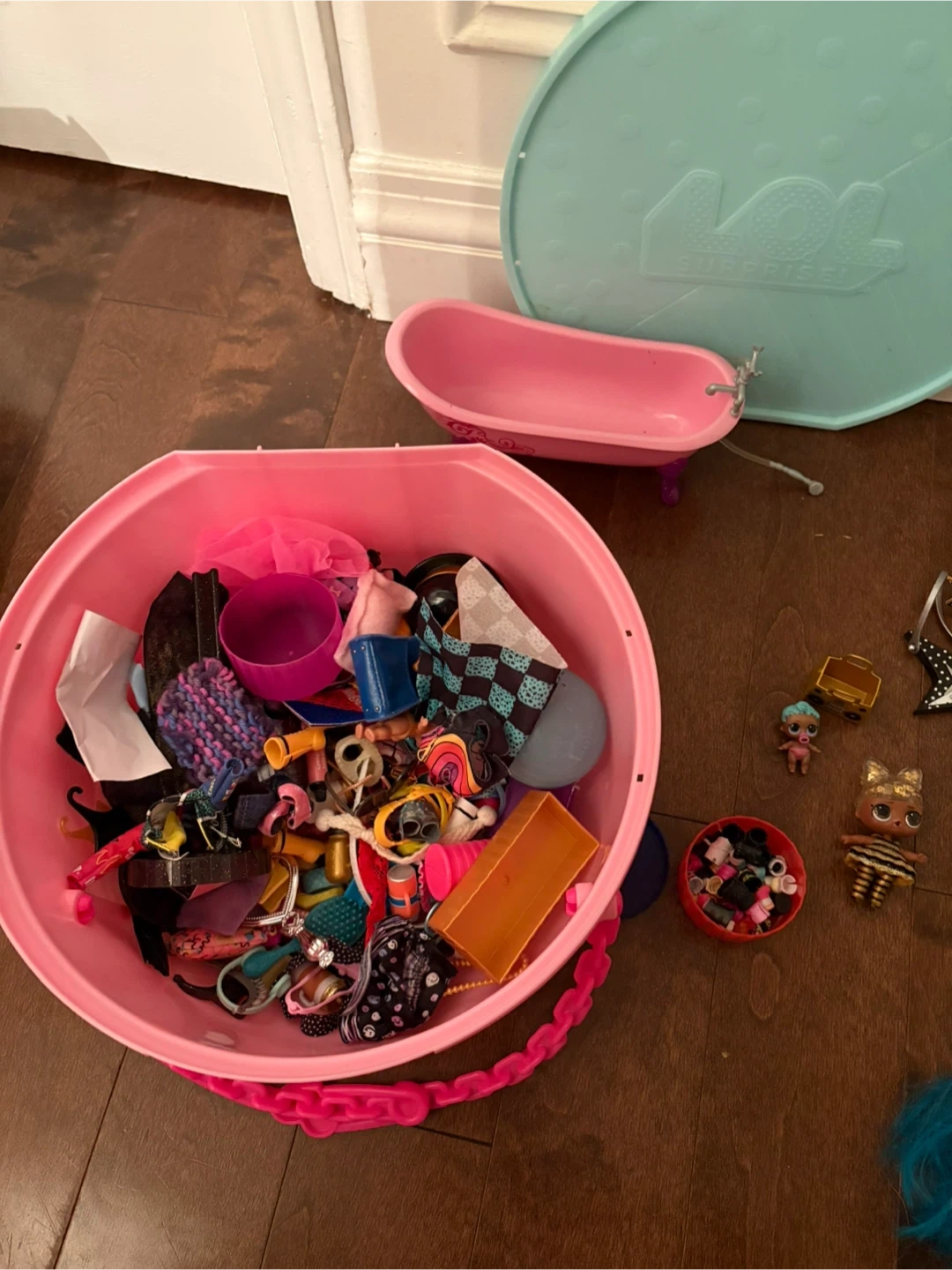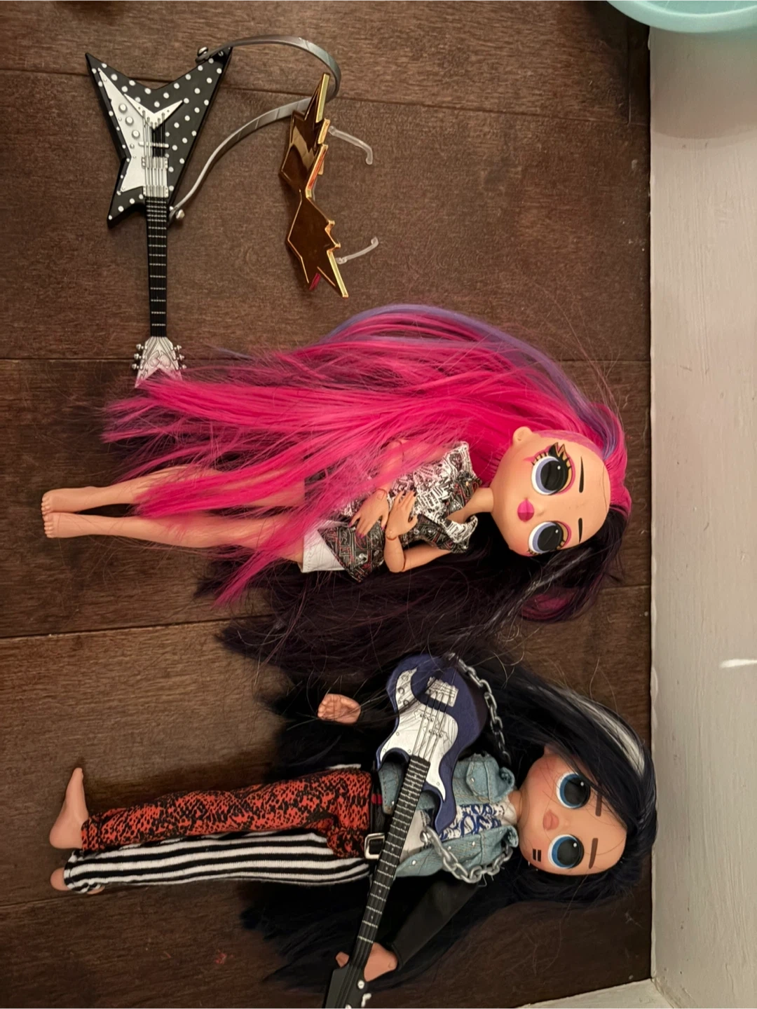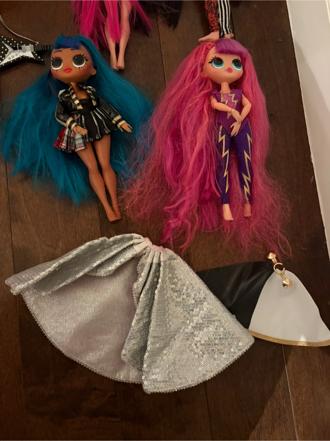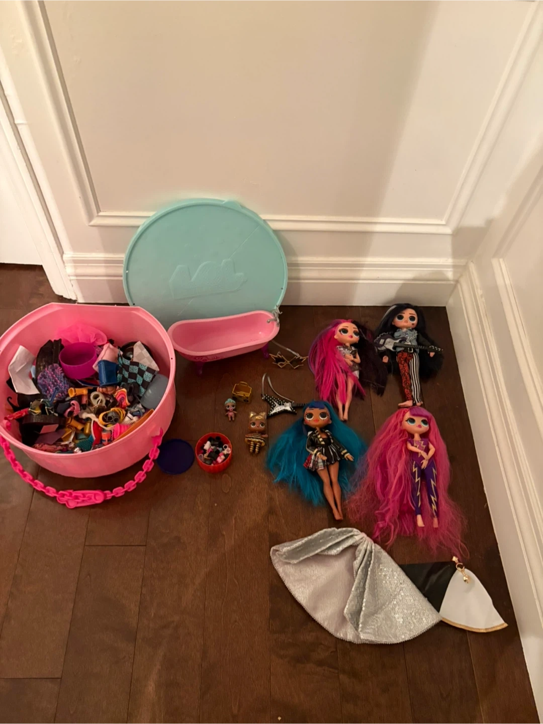 Selling a collection of L.O.L. Surprise! OMG dolls, L.O.L game house, with various accessories. Includes dolls with unique hairstyles and outfits, along with accessories like guitars and clothes. There's also a playset and a container full of doll accessories!