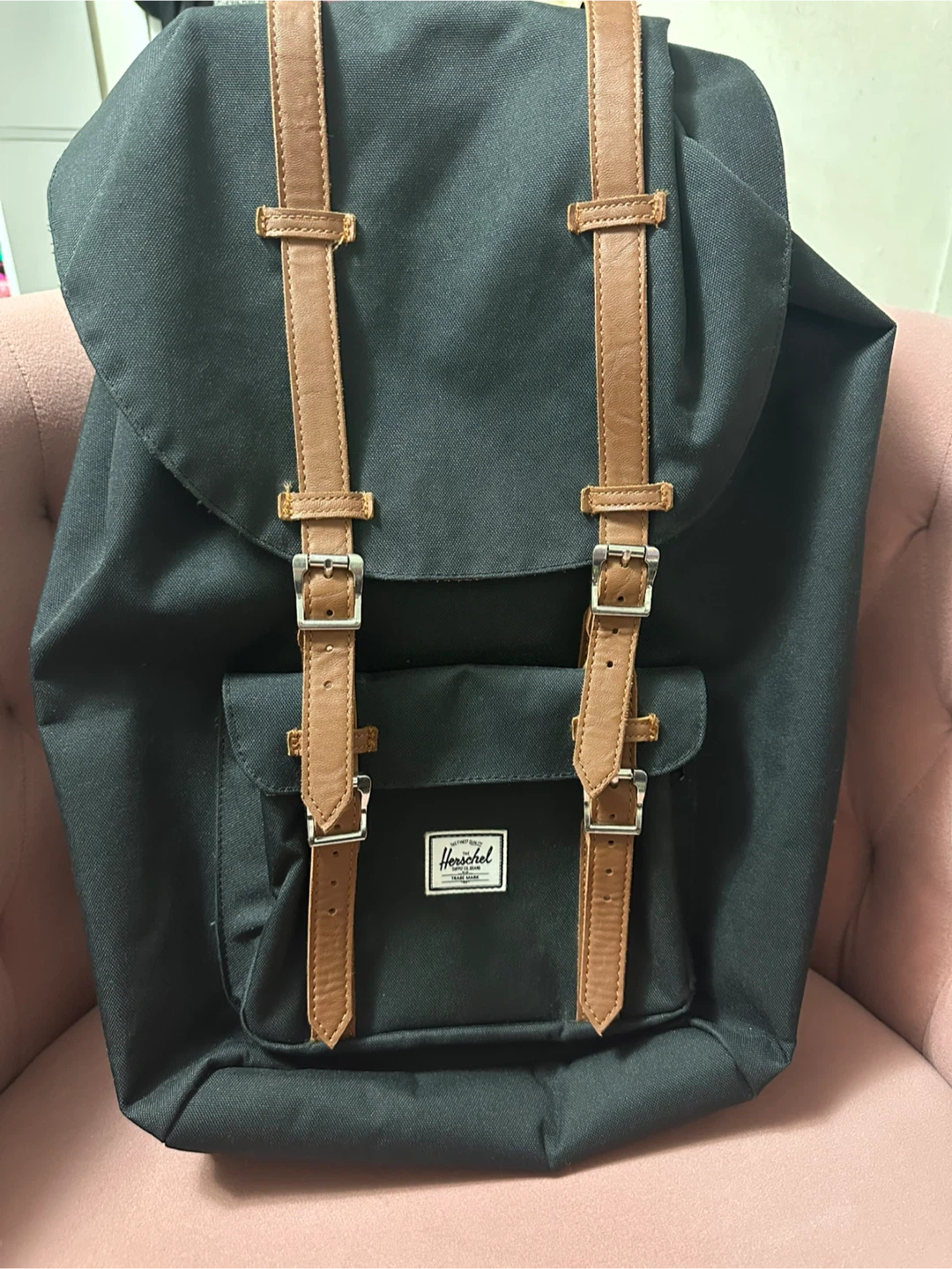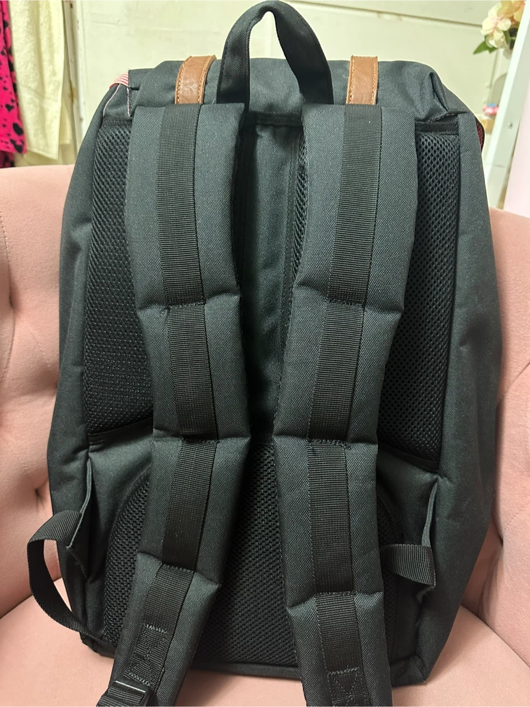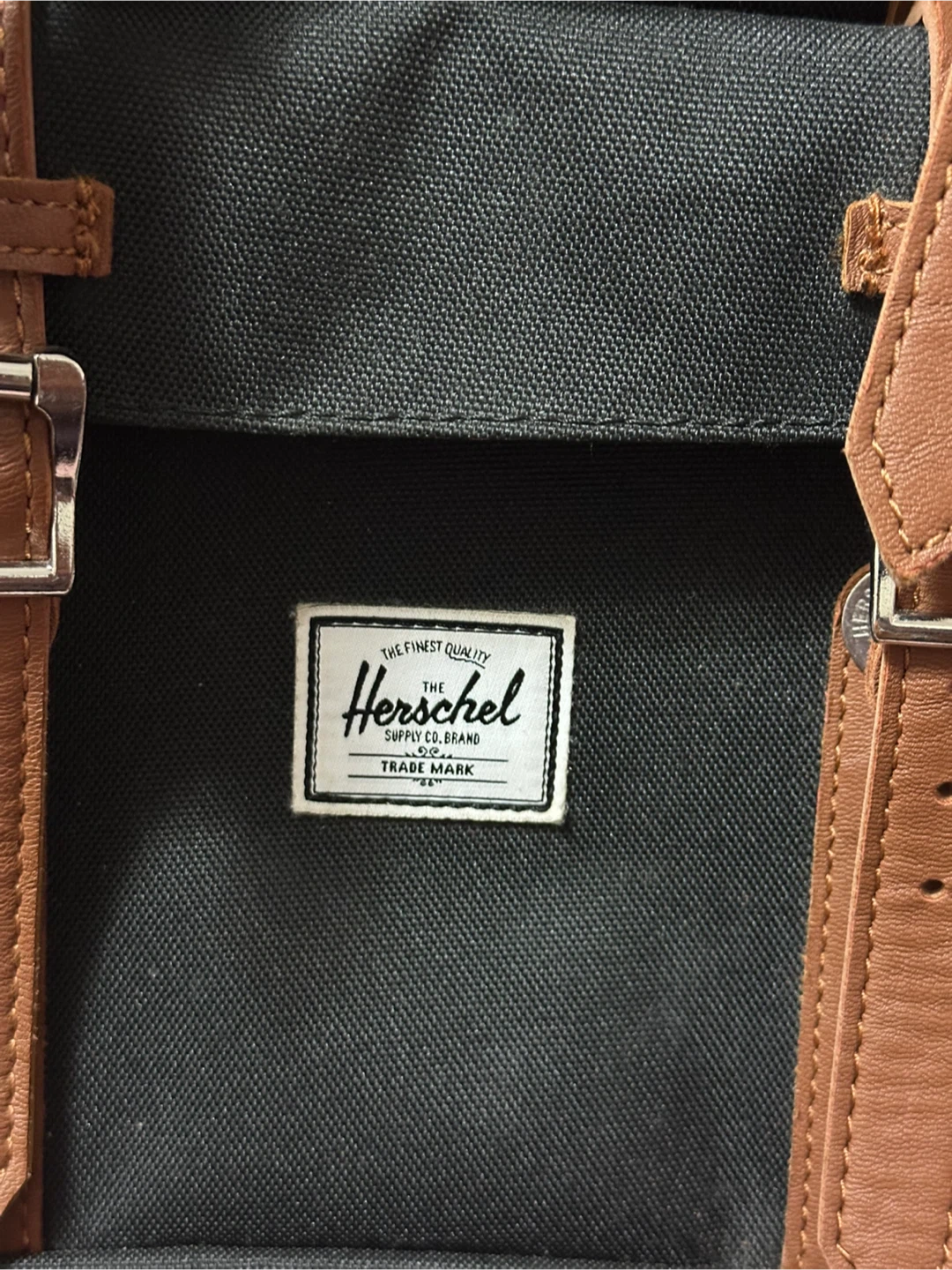 Herschel Supply Co. Little America backpack with a black exterior and brown leather straps. The interior is lined with a red and white striped fabric. It's in good condition except for a rip in the interior side pocket