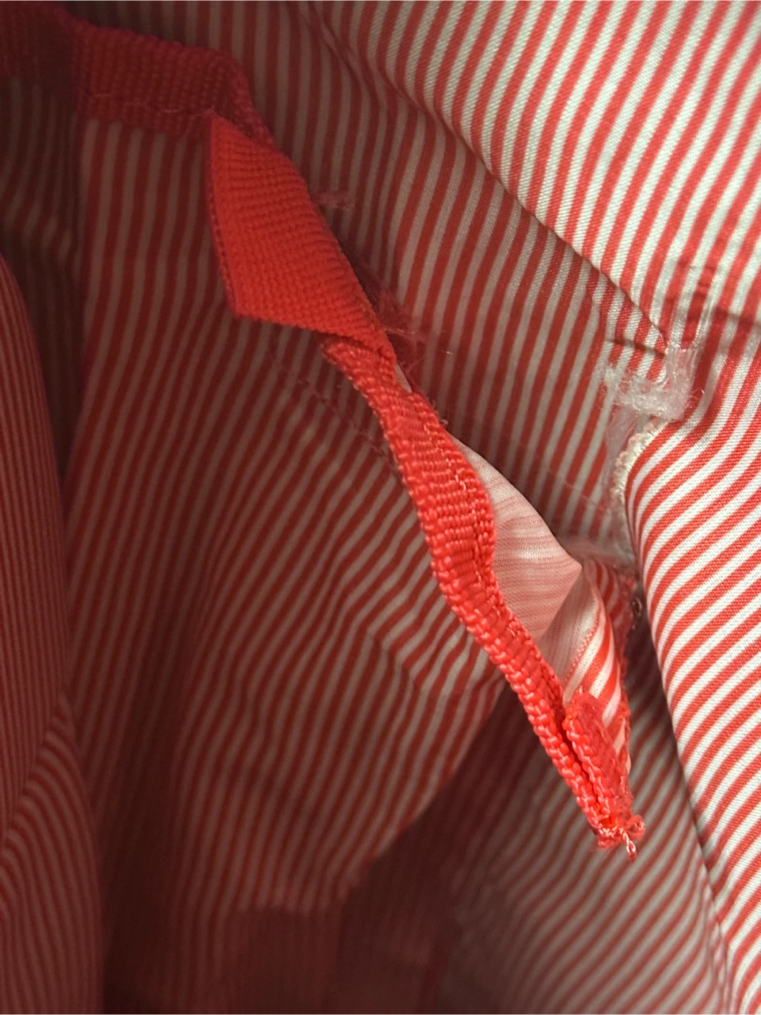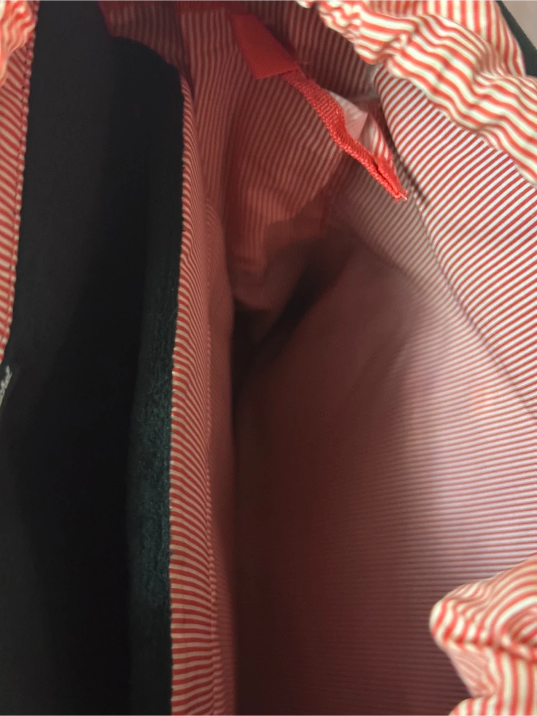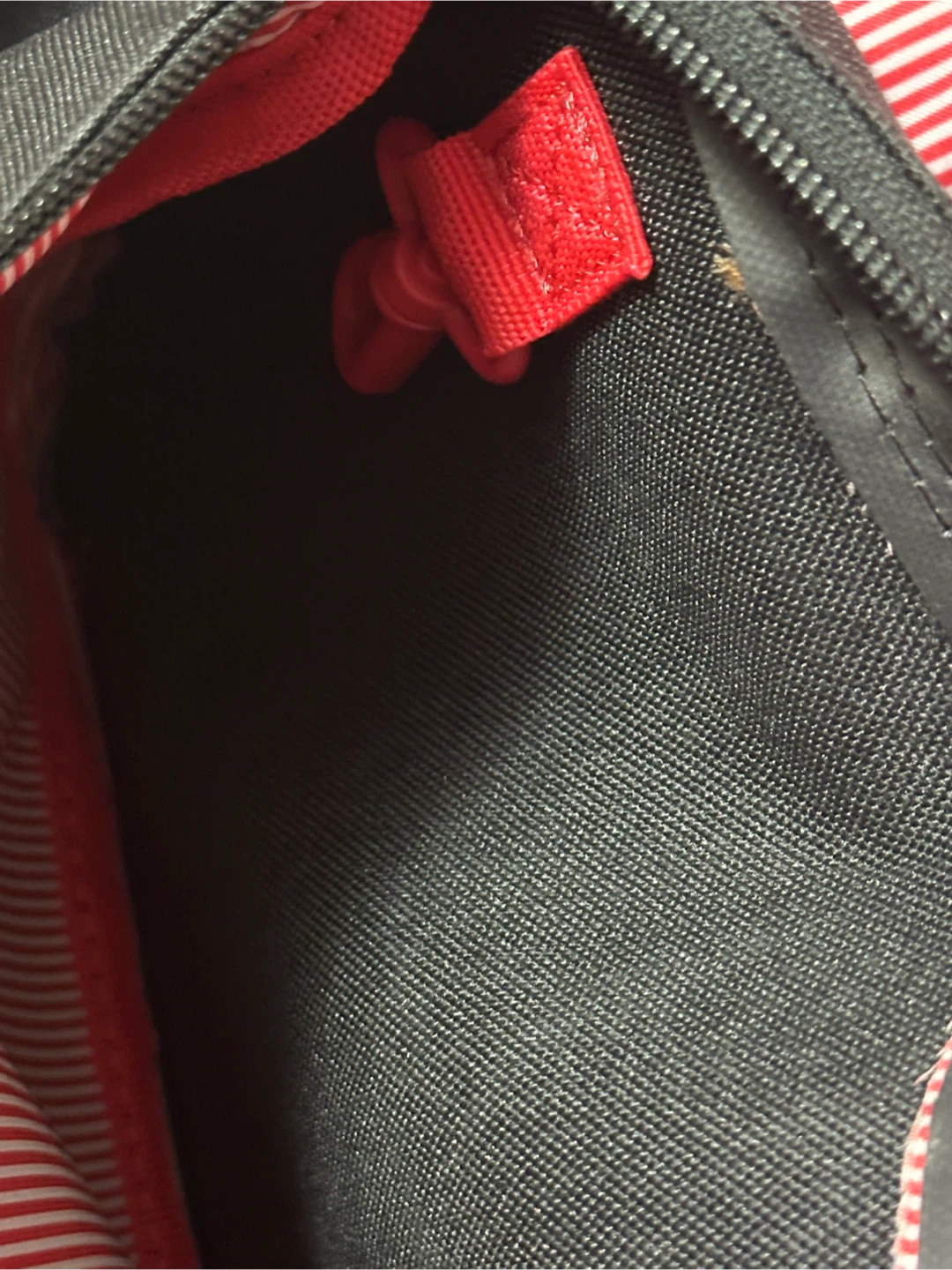 Herschel Supply Co. Little America backpack with a black exterior and brown leather straps. The interior is lined with a red and white striped fabric. It's in good condition except for a rip in the interior side pocket