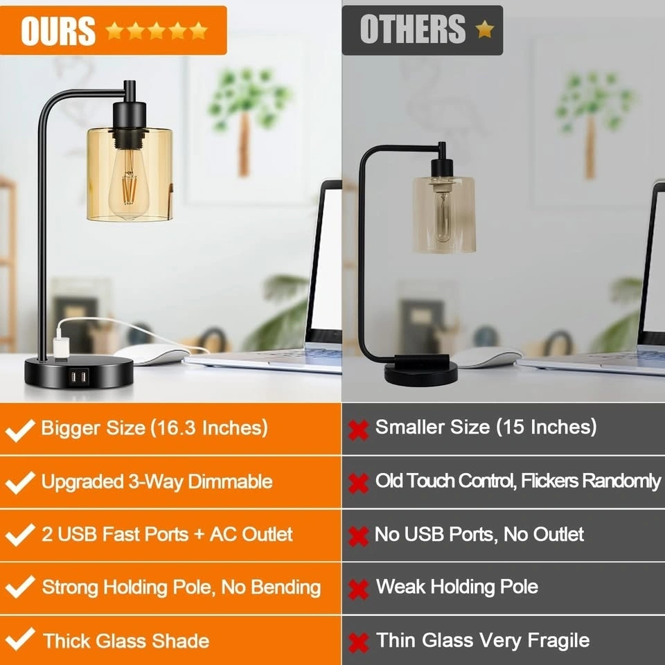 Set of 2 Industrial Touch Control Table Lamps with 2 USB Ports and AC Outlet - 3-Way Dimmable Black Bedside Lamp Nightstand Desk Lamps for Bedroom Living Room, Amber Glass Shade & 2 LED Bulbs Included