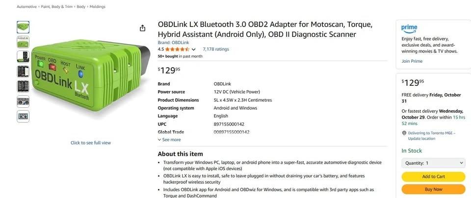 OBDLink LX Bluetooth 3.0 OBD2 Adapter for Motoscan, Torque, Hybrid Assistant (Android Only), OBD II Diagnostic Scanner