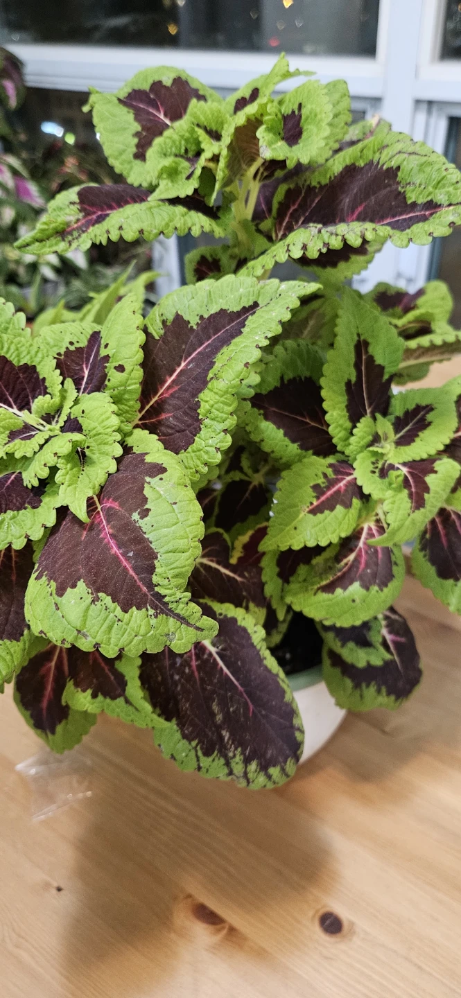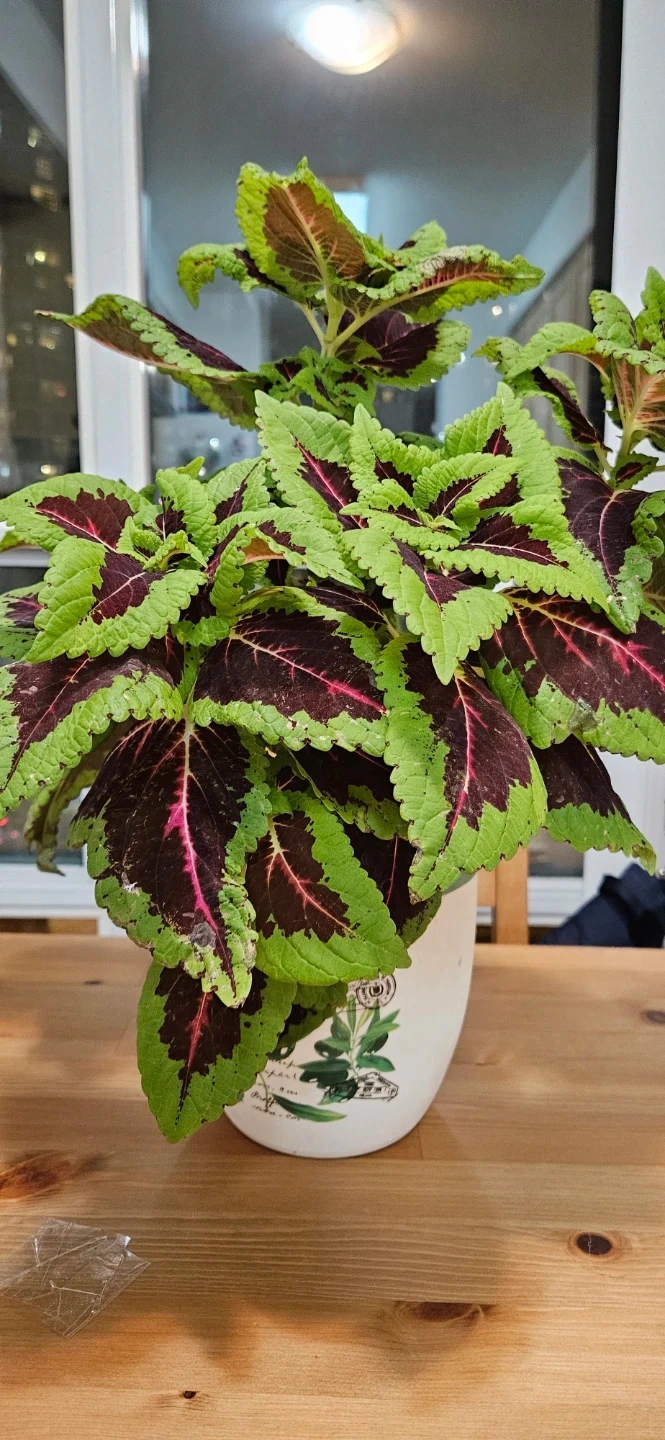 Selling a vibrant Coleus plant, perfect for adding a splash of colour to your home! It comes in a cute white pot with a botanical design. This plant is super easy to care for and will thrive indoors with bright, indirect light