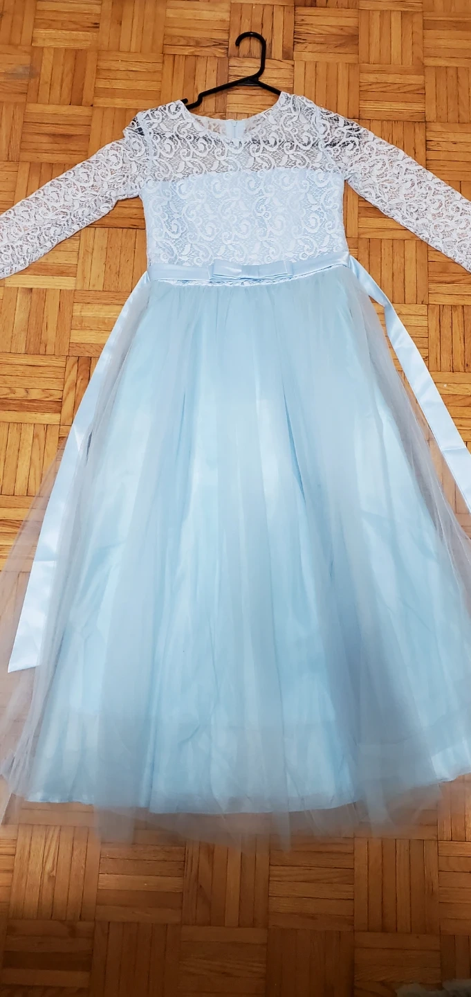 This is a lovely light blue dress for a girl, featuring delicate lace on the bodice and sleeves, and a flowy tulle skirt. It has a sweet ribbon tie at the waist. Perfect for a special occasion!