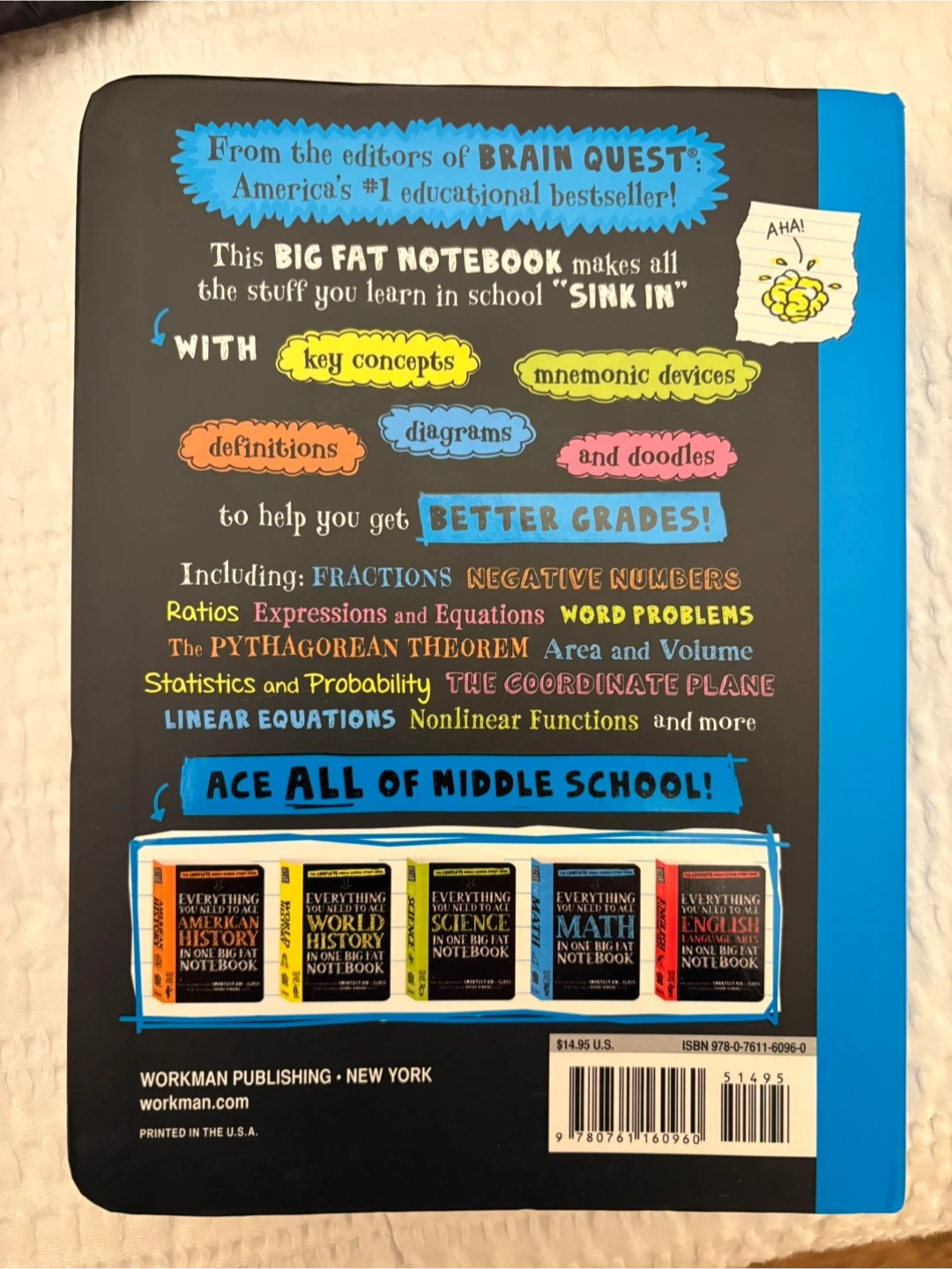 Selling the book 'Everything You Need to Ace Math in One Big Fat Notebook'! This book is designed to help you ace all of middle school math. It includes key concepts, mnemonic devices, definitions, diagrams, and doodles to help you get better grades. It covers fractions, negative numbers, ratios, expressions and equations, word problems, the Pythagorean theorem, area and volume, statistics and probability, the coordinate plane, linear equations, and nonlinear functions