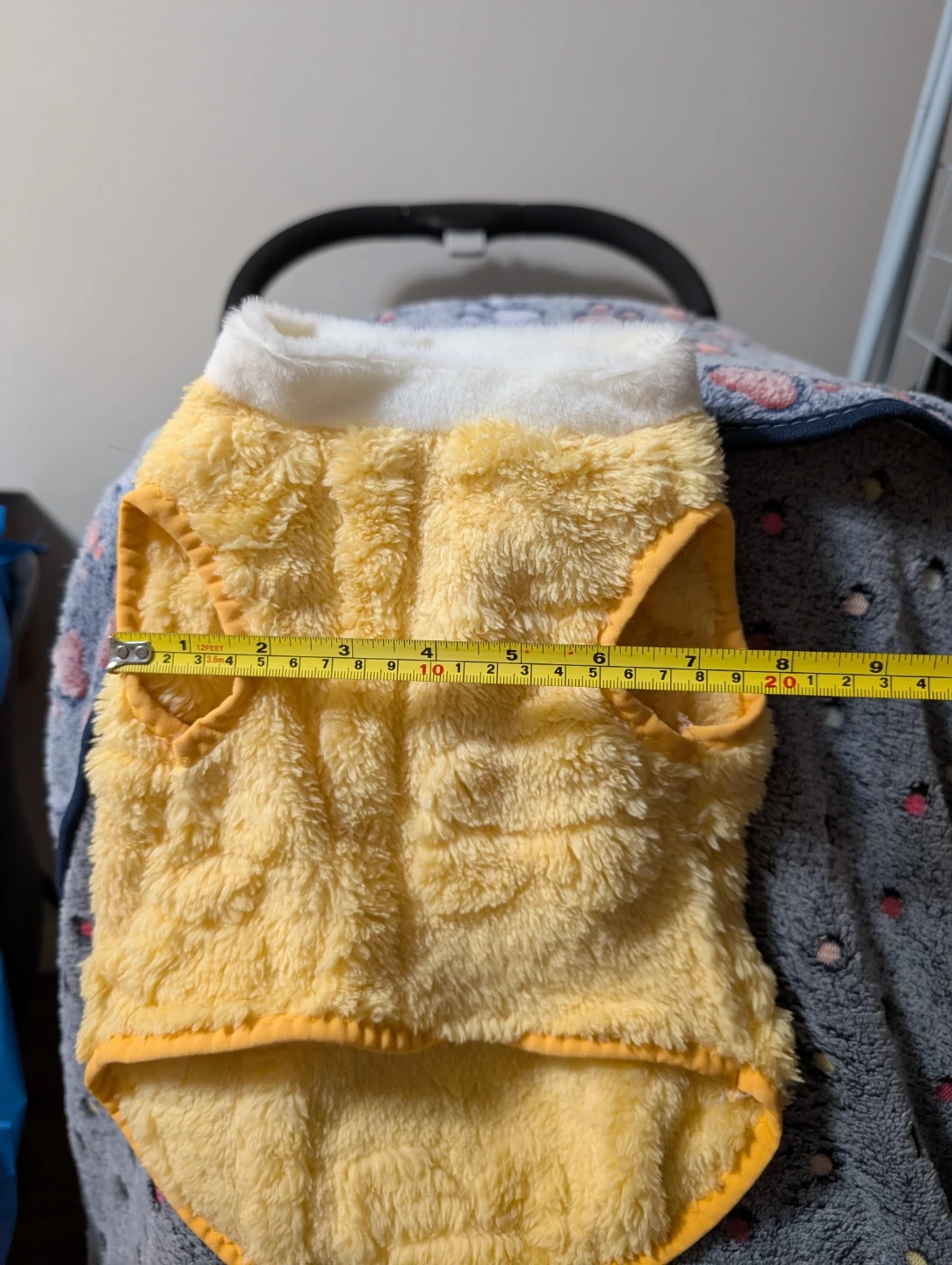 This adorable fluffy yellow fleece dog vest is perfect for keeping your furry friend warm! It's in great condition and is approximately 9 inches wide and 13 inches long. It was listed as a size L but I'm not sure if that's accurate. I bought it for my cat and he's 16 lbs. It wasn't long enough in the body for him. It was only tried on once.