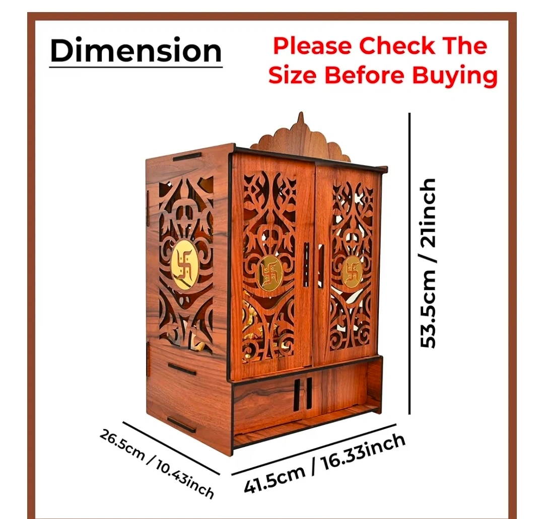 Selling a wooden Pooja Mandir, perfect for your home! It features intricate carvings and includes drawers for storage. The dimensions are approximately 53.5cm (21 inches) in height, 41.5cm (16.33 inches) in width, and 26.5cm (10.43 inches) in depth