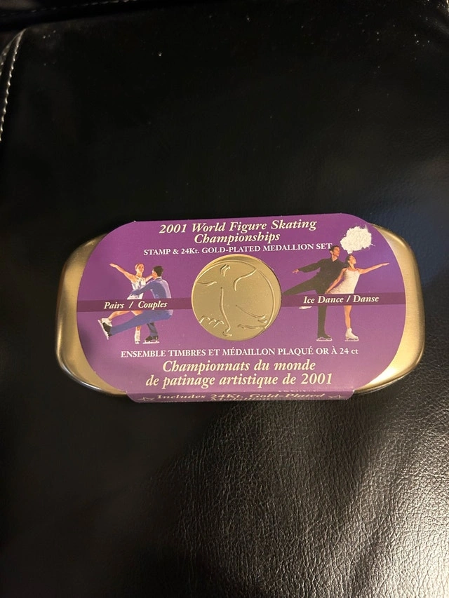 This is a 2001 World Figure Skating Championships stamp and 24K gold-plated medallion set, still in its original presentation tin. It's a cool collectible for any figure skating fan! Cash only Pickup in East York