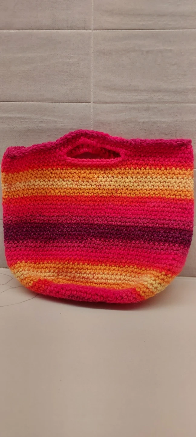 Bright pink/orange sunset striped crochet bag with a built-in handle. Great for quick errands or a lunch bag.