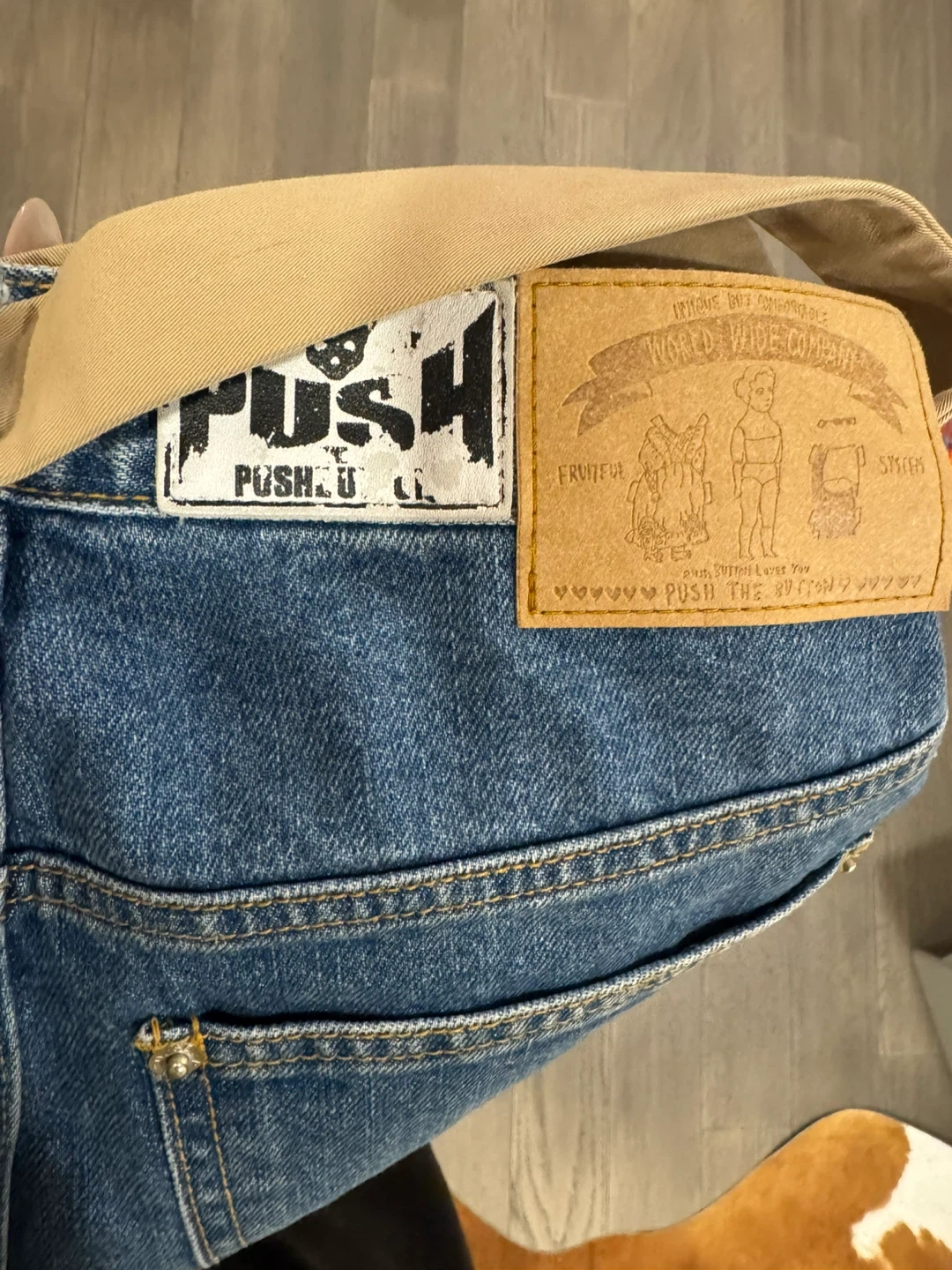 Selling a pair of PUSHBUTTON pants! These are a unique design with a beige top layer and denim underneath. Size small. They’re in great condition! The jeans shown in the image are made by the brand Pushbutton, specifically a vintage or unique design style that may also use the name PUSHU Co.. The leather patch includes text "WORLD WIDE COMPANY" and "PUSH THE BUTTON" with graphics, which are elements associated with the brand. Pushbutton is a Seoul-based fashion label known for its quirky, genderless, and vintage-inspired designs that often incorporate unique detailing and innovative textiles. The founder, a former K-Pop star, named the label after Madonna's song "Hollywood" lyrics.