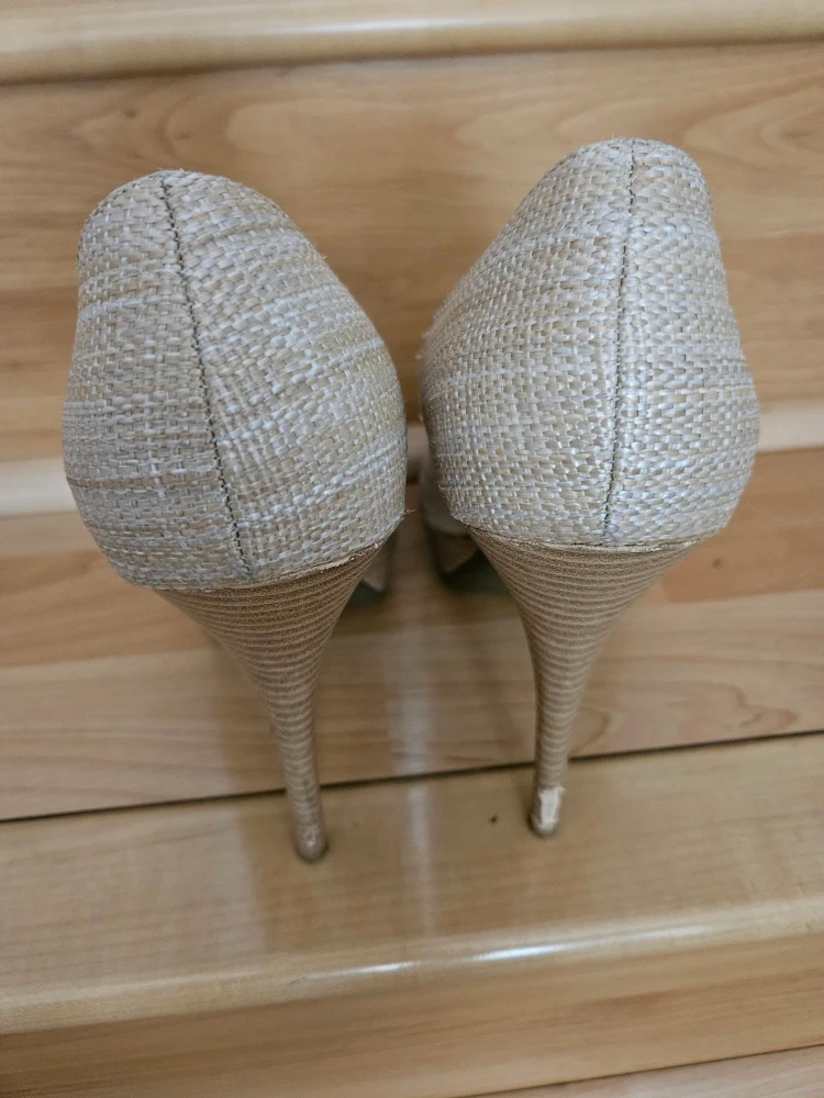 Selling a pair of Bamboo heels in a size 9. They have a woven texture and a gold interior. The heels are in good condition.