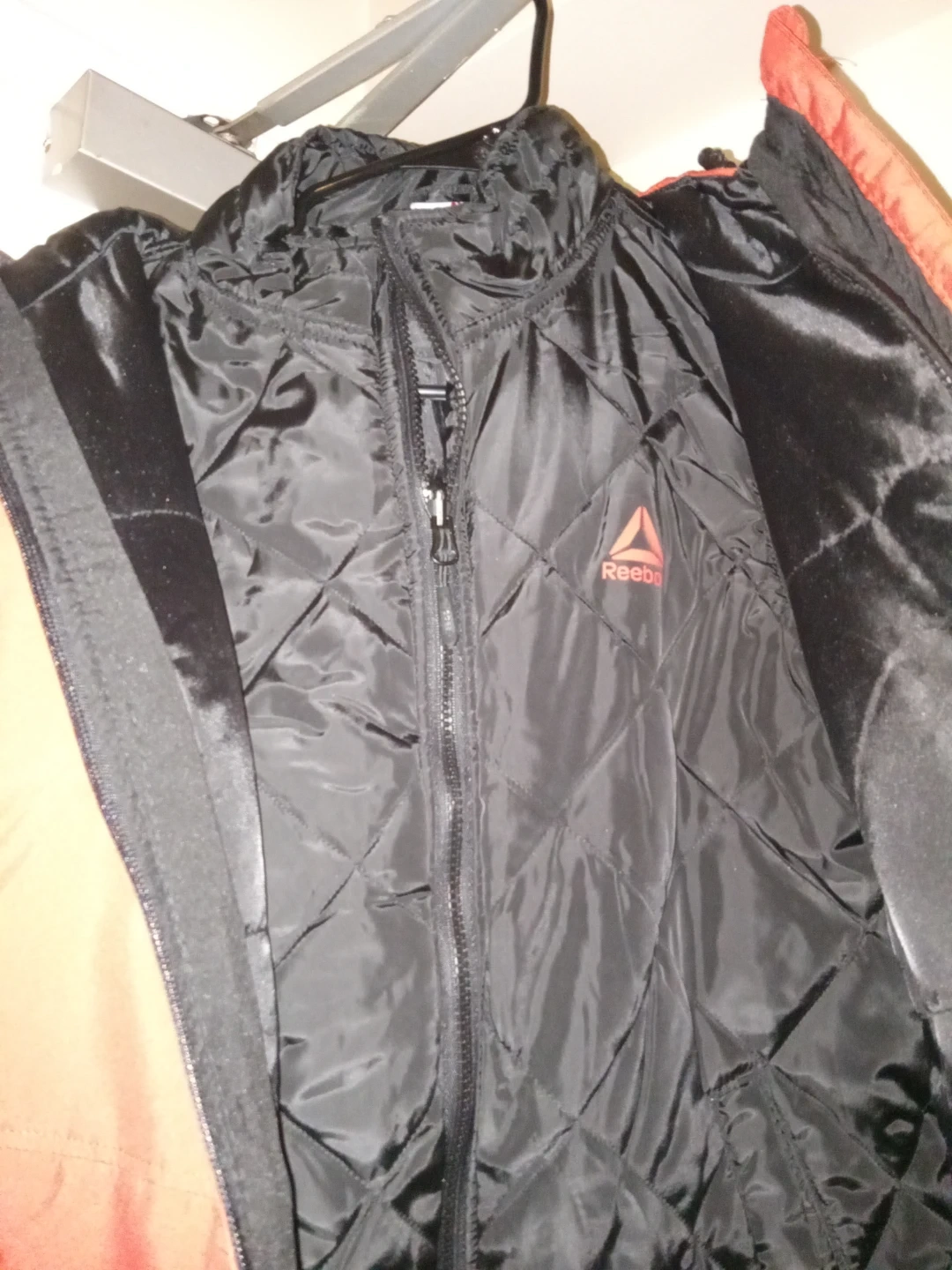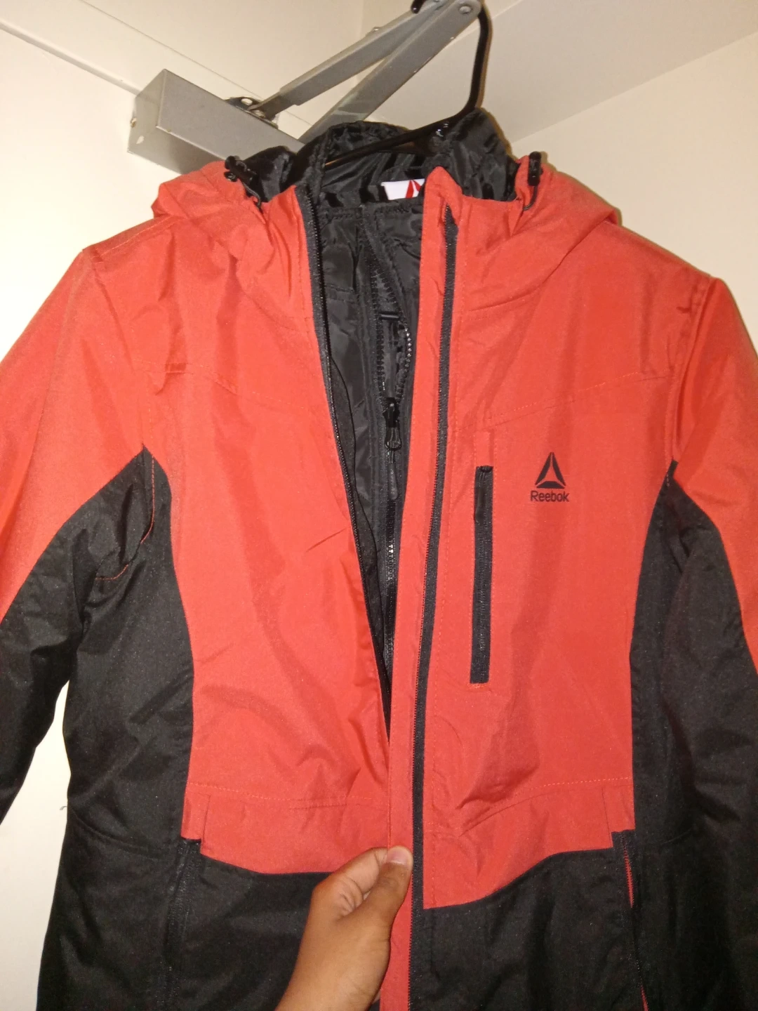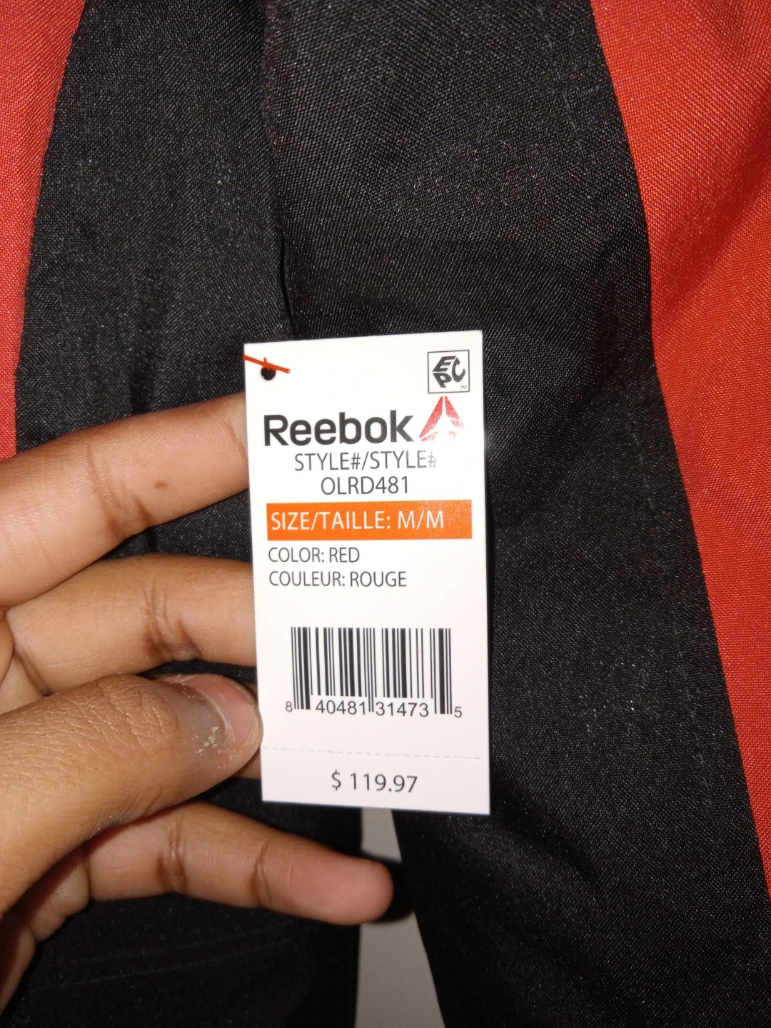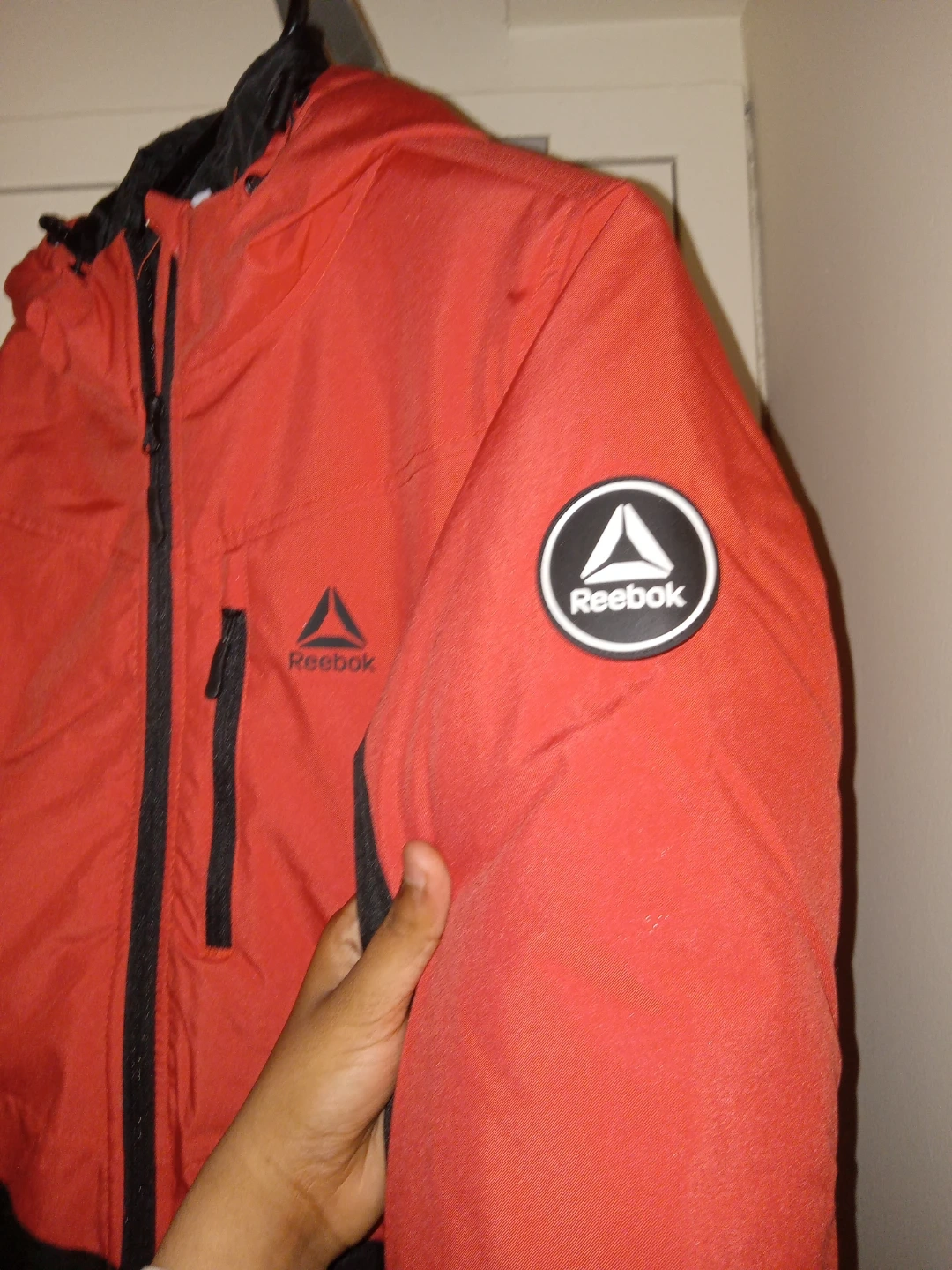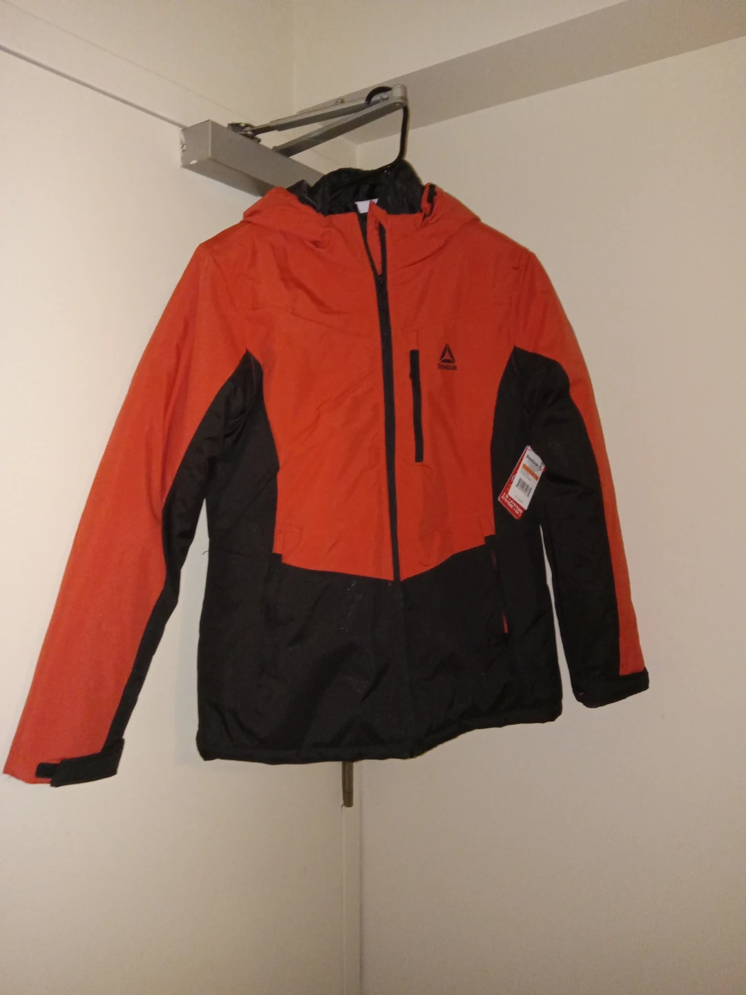 Selling a Reebok jacket in red and black, size medium. It's brand new and ready for the colder weather! The style number is OLRD481. Originally bought for $119.97