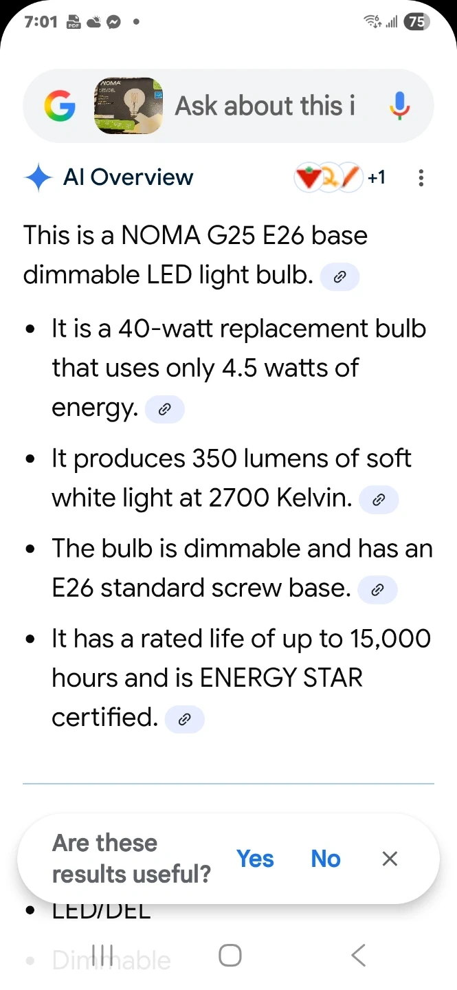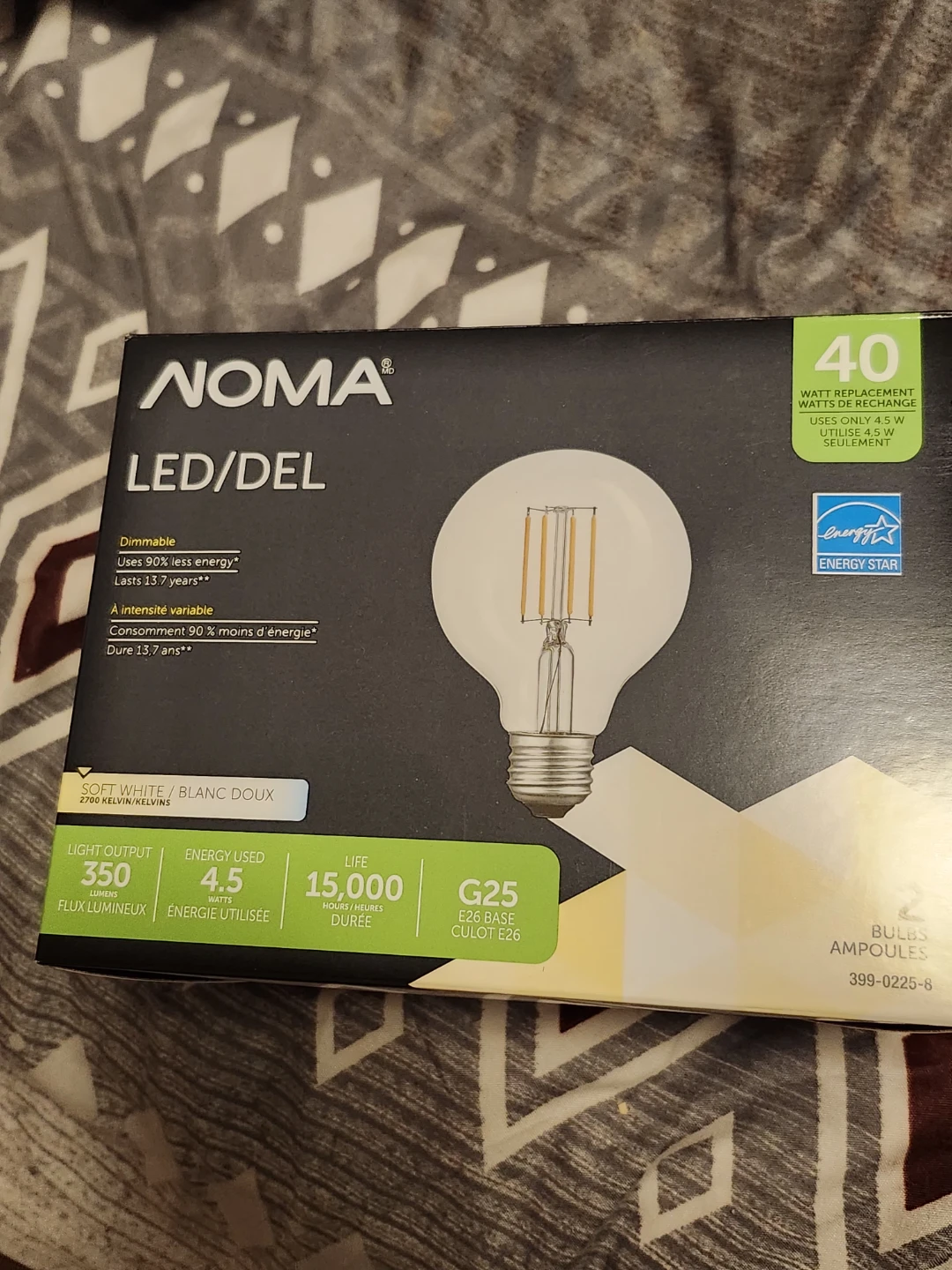 Selling a NOMA G25 E26 base dimmable LED light bulb. It's a 40-watt replacement bulb that uses only 4.5 watts of energy. This bulb produces 350 lumens of soft white light at 2700 Kelvin and has a rated life of up to 15,000 hours. It's also ENERGY STAR certified