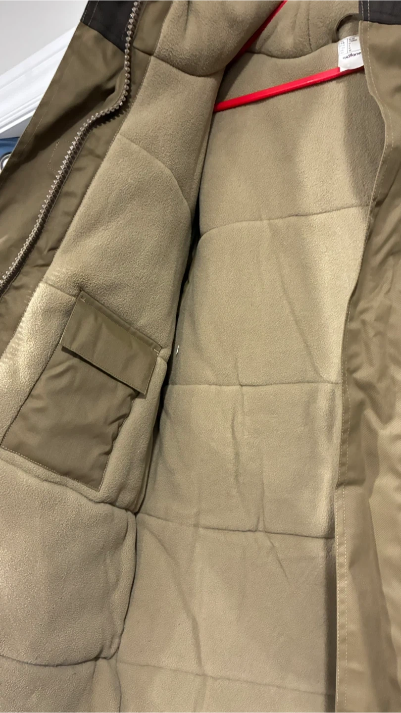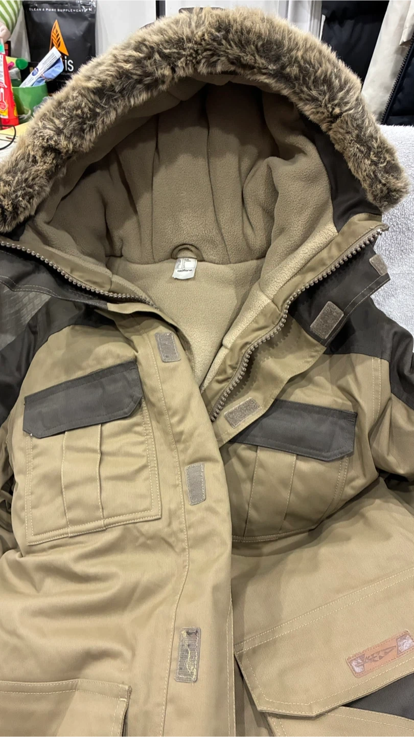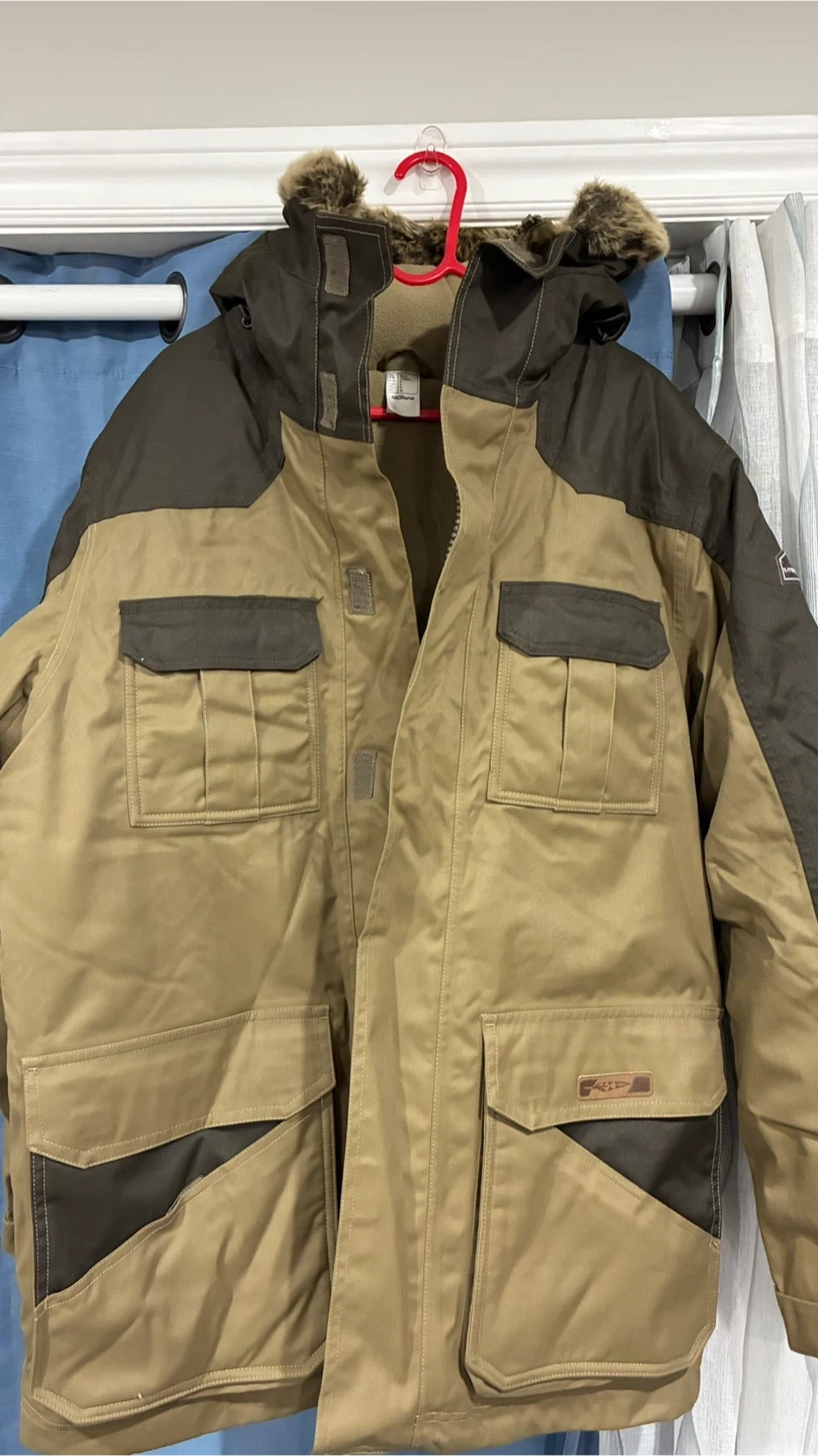 Selling a winter parka in size M. It's a great jacket for keeping warm during those cold Canadian winters! The jacket features a hood with faux fur trim and lots of pockets!