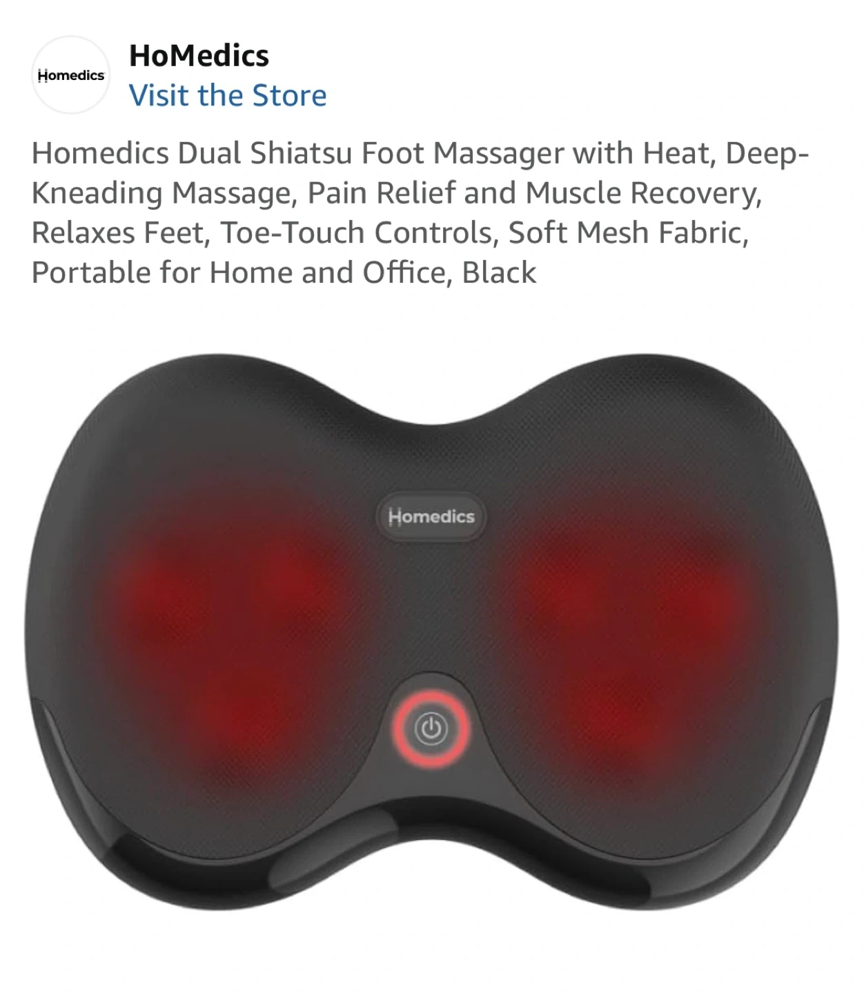 I'm selling a HoMedics Dual Shiatsu Foot Massager with Heat. It provides a deep-kneading massage for pain relief and muscle recovery. It relaxes feet with toe-touch controls and has a soft mesh fabric. It's portable for home and office use, and it's black!
