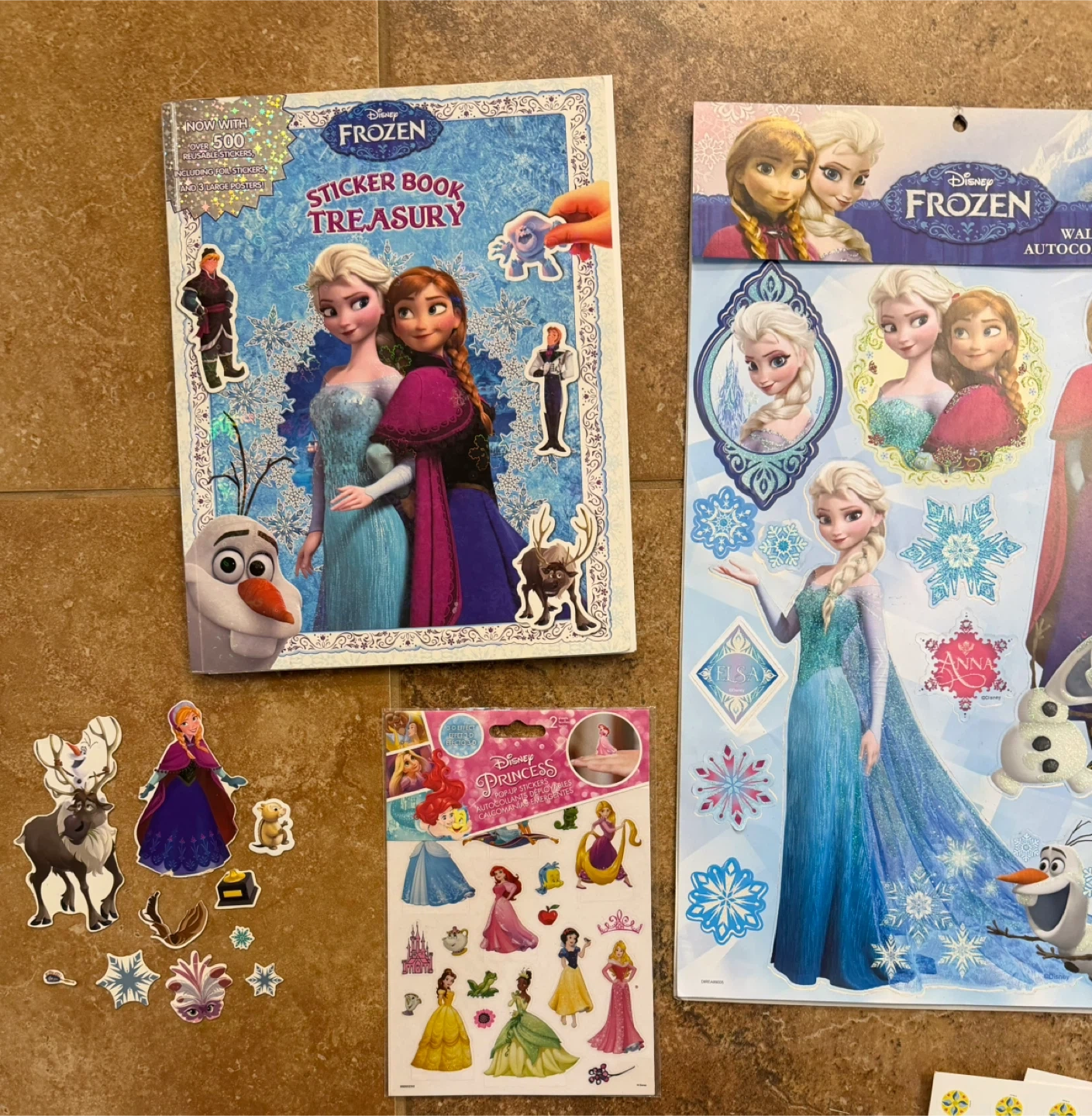 This Disney Frozen package includes a Frozen sticker book treasury and Frozen wall stickers, alongside Disney Princess pop up stickers and 10 magnets. items are used , wall stickers & pop up stickers are new. Package includes