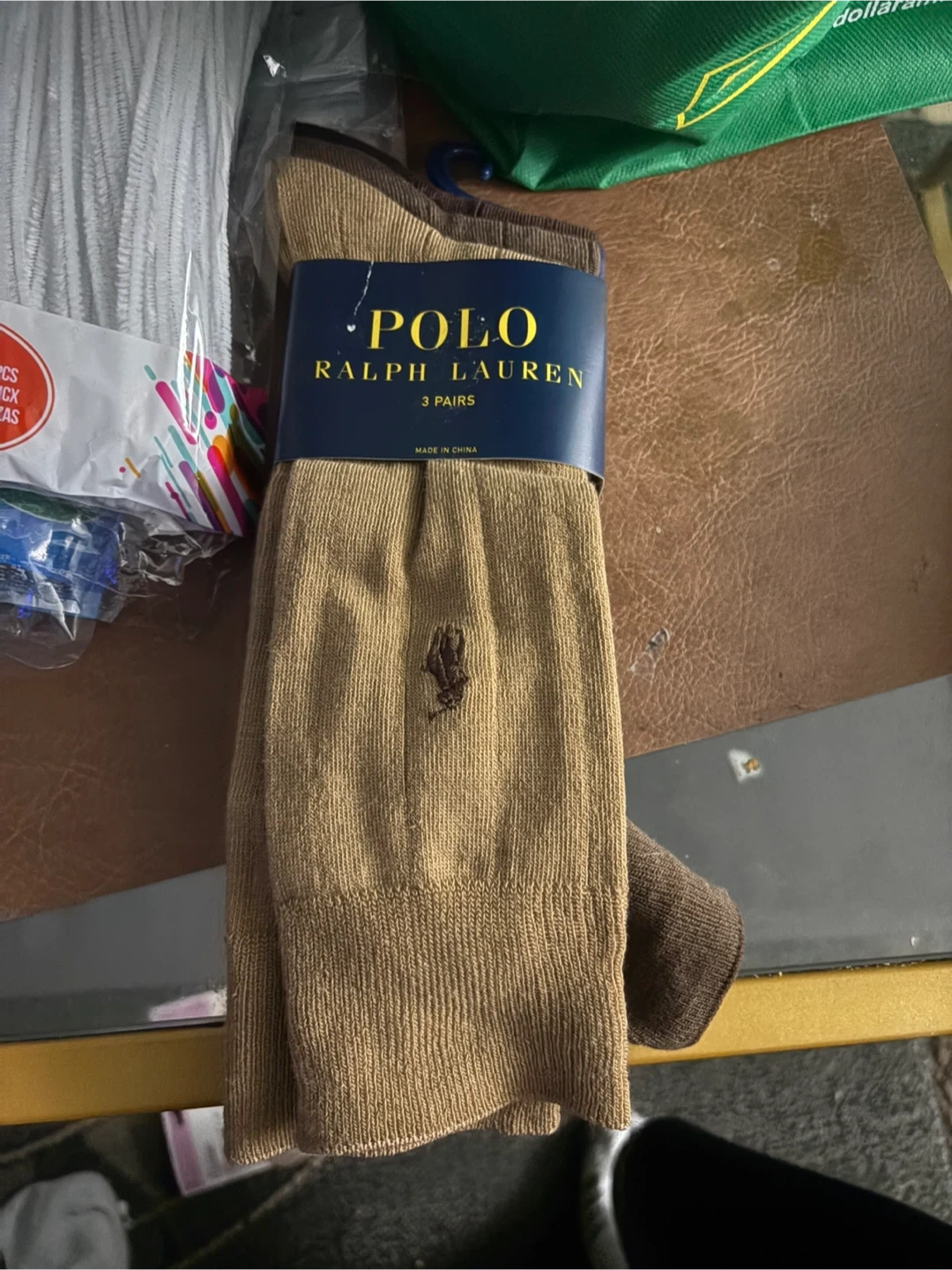 Selling a pack of Polo Ralph Lauren socks, includes 3 pairs. The socks are a tan/khaki colour with the Polo logo embroidered on them.