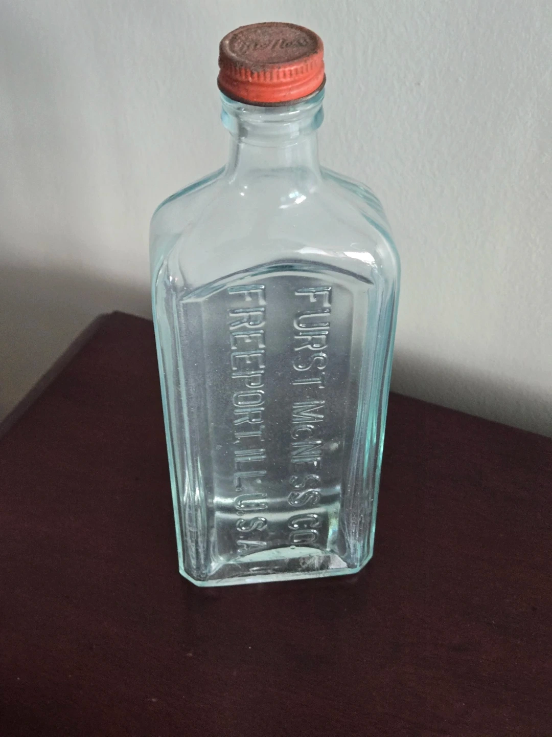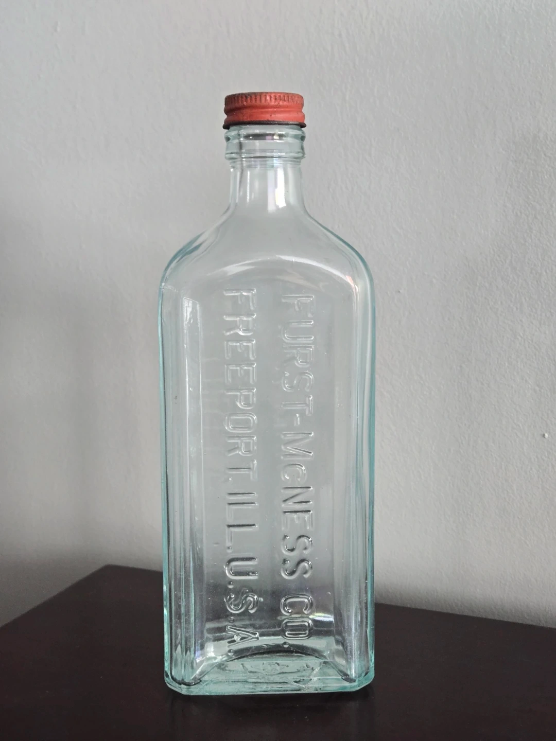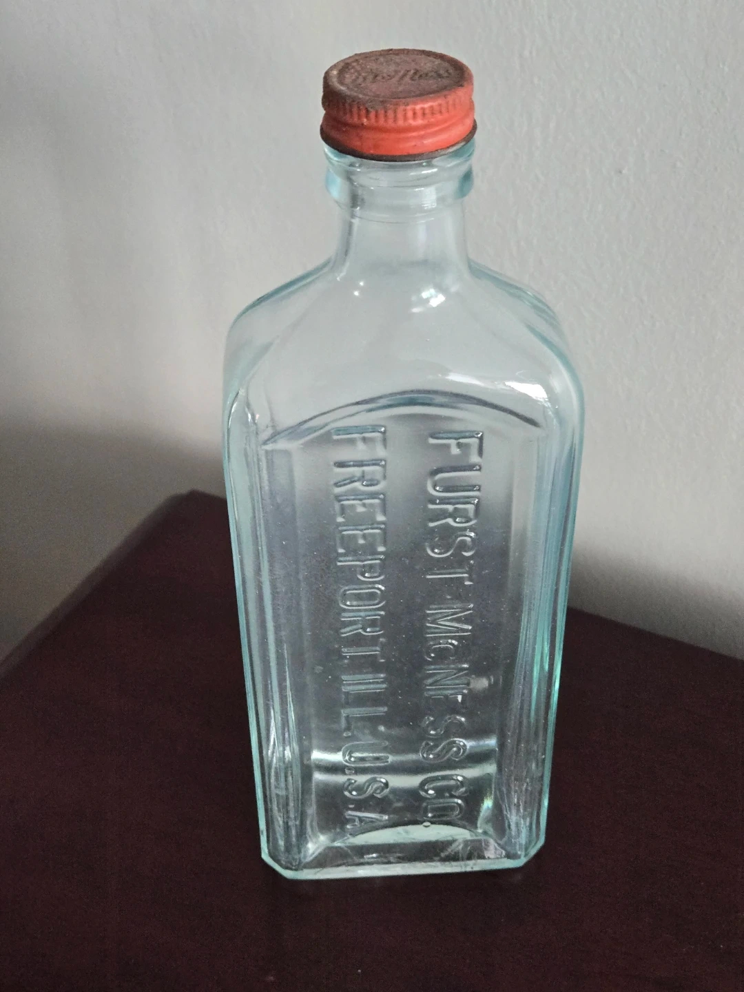 Selling a vintage glass bottle from Furst-McNess Co. in Freeport, Illinois, U.S.A. It has a unique shape and embossed lettering. Great for collectors or as a decorative piece!