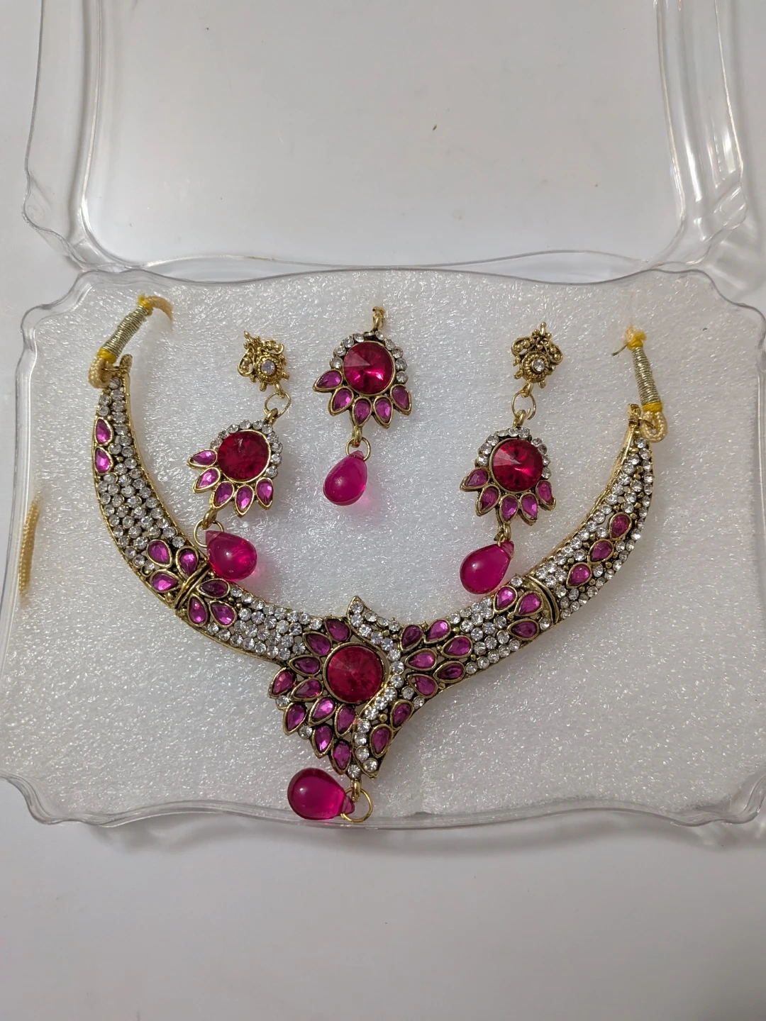 Beautiful necklace and earring set in a gold tone with pink accents and clear rhinestones. Comes in a clear plastic box to keep it safe and organized. Perfect for adding a touch of elegance to any outfit!