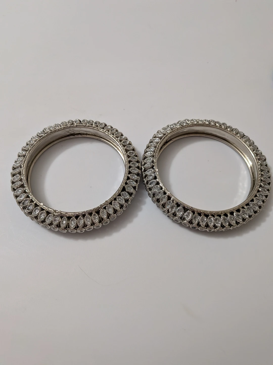 Selling a set of two silver bangles. They have a beautiful design with small stones set around the band. Perfect for adding a touch of sparkle to any outfit!
