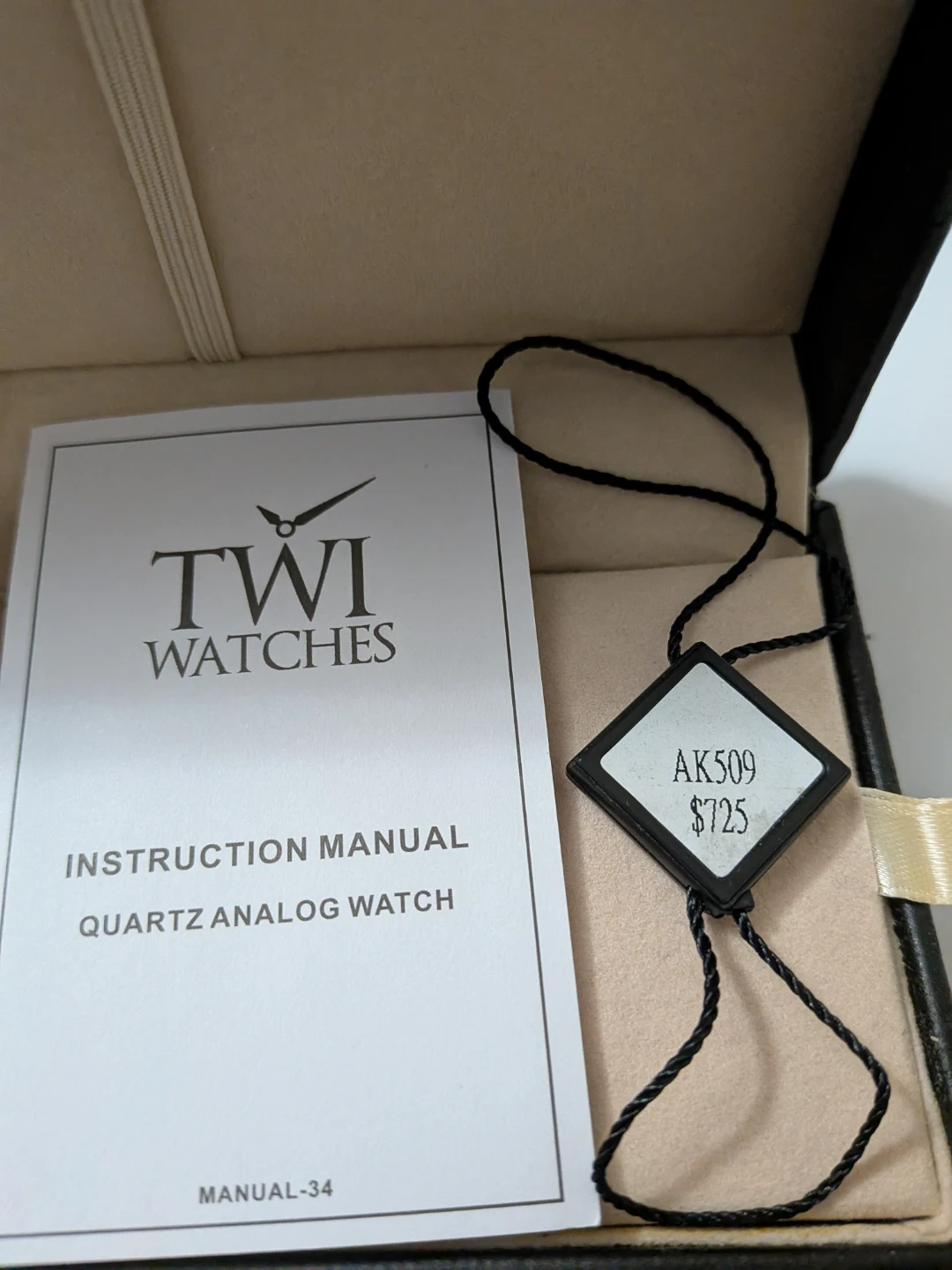 Selling an Akribos XXIV quartz analog watch, model AK509. It comes in its original box with the instruction manual. The watch has a sleek black design. Originally priced at $725!