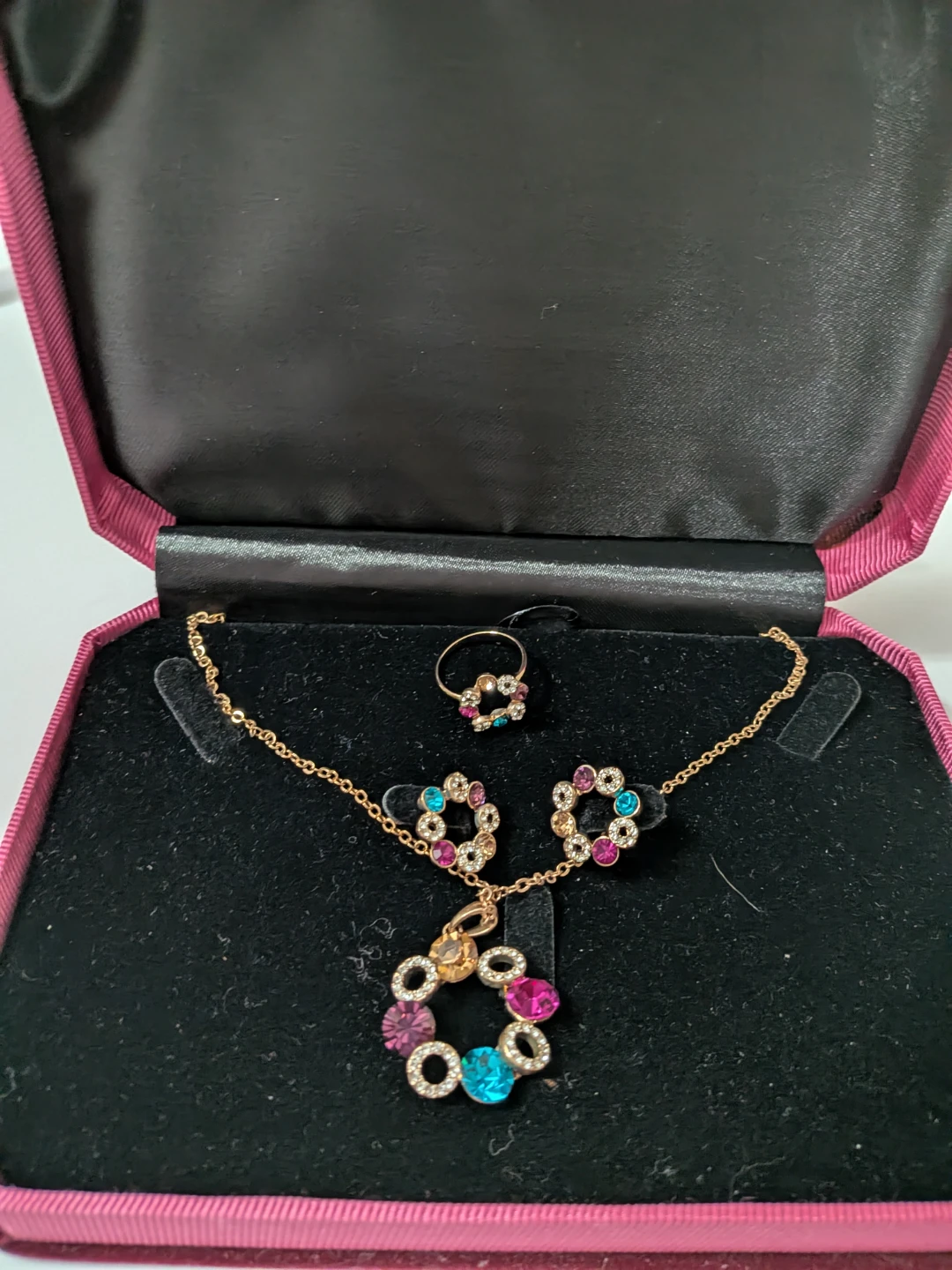 Selling a cute jewellery set that includes a necklace, a ring, and a pair of earrings! The set comes in a box, perfect for gifting or keeping everything organized
