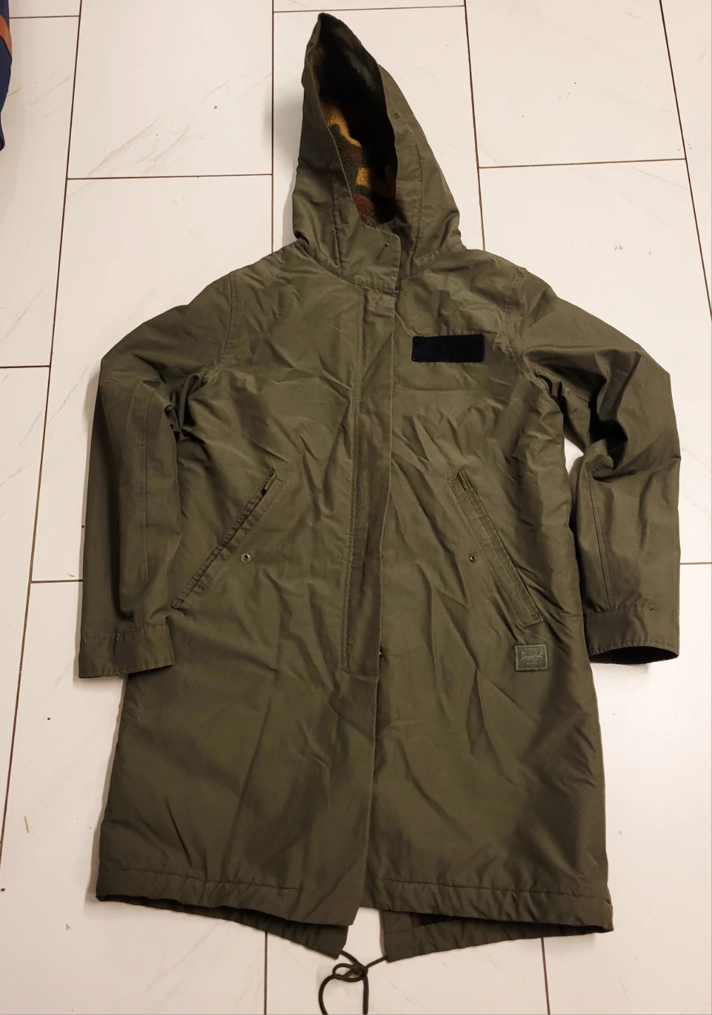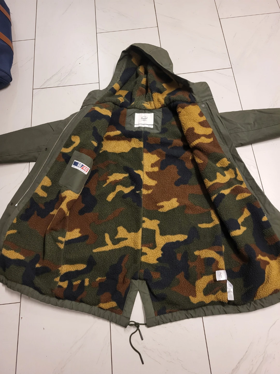 Selling a Herschel parka in olive green. It's a size M and in great condition! The inside is lined with a camouflage pattern fleece. Perfect for the cooler weather!