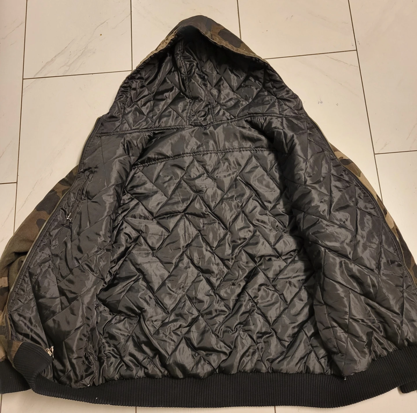 Here's a cool camo print hooded jacket! It features a zipper closure and a quilted lining. Perfect for adding a bit of edge to your everyday style