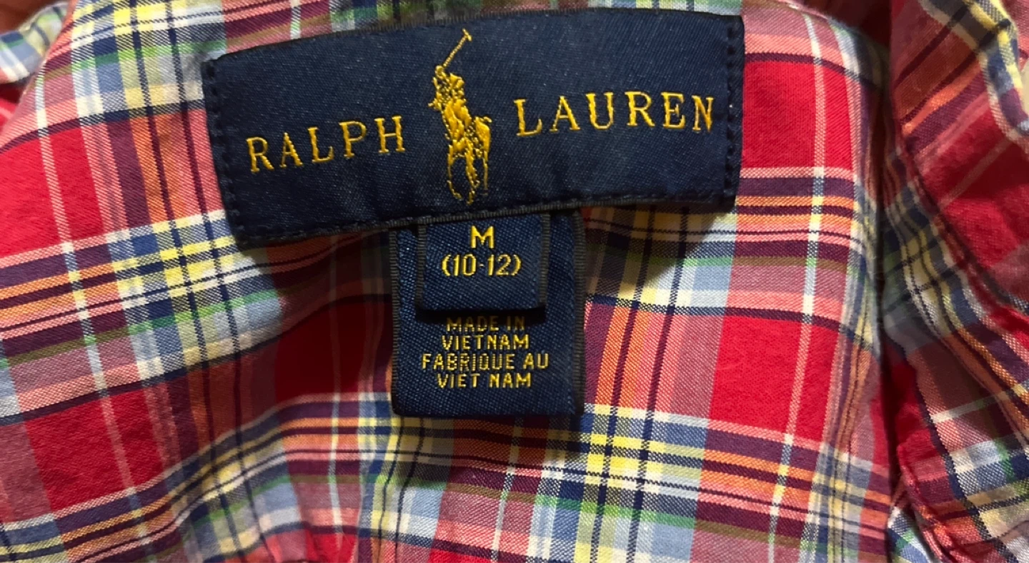 Here's a Ralph Lauren button-down shirt in a colourful plaid pattern! It's a size M (10-12). The shirt is made in Vietnam and has the classic Ralph Lauren logo on the chest