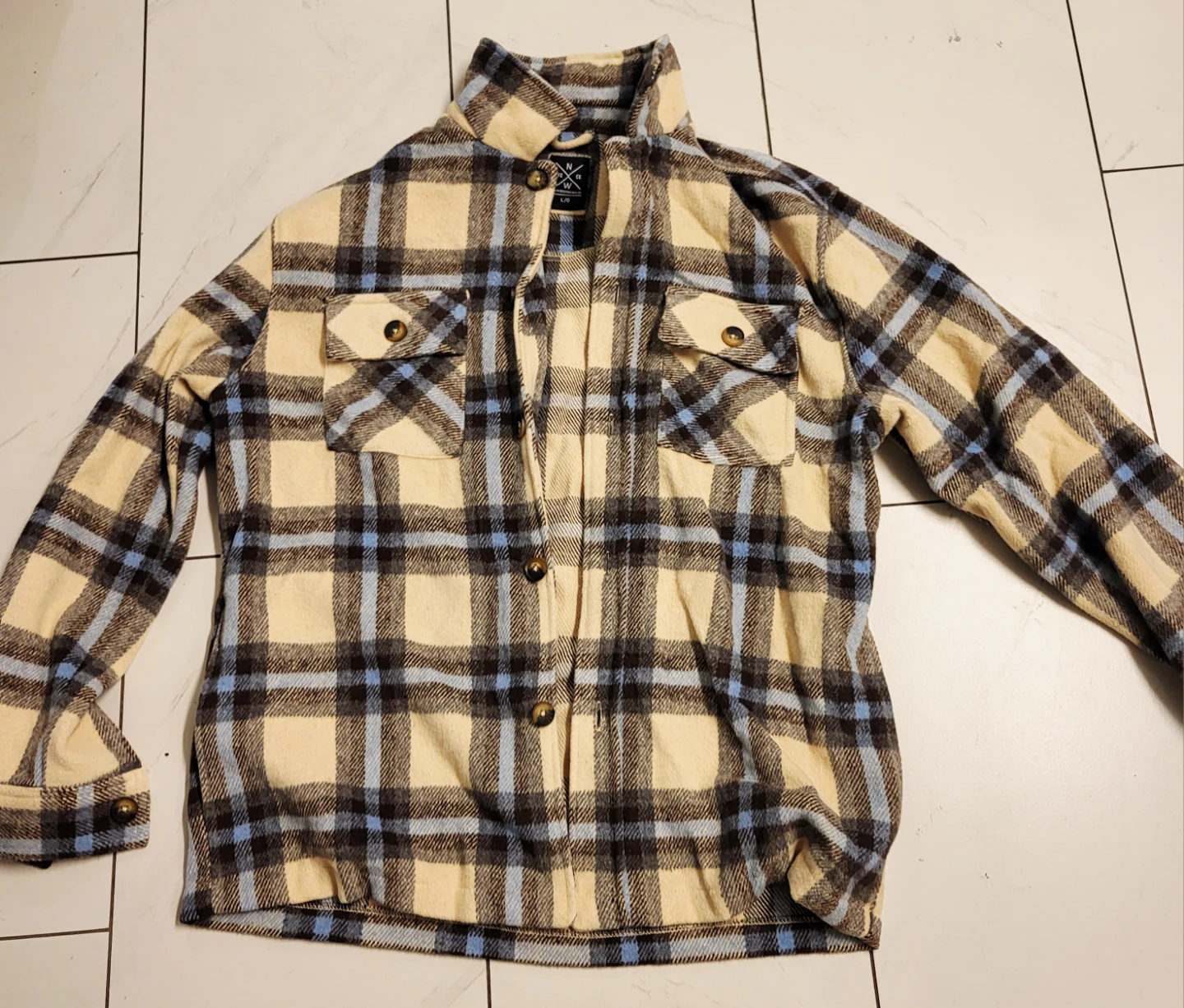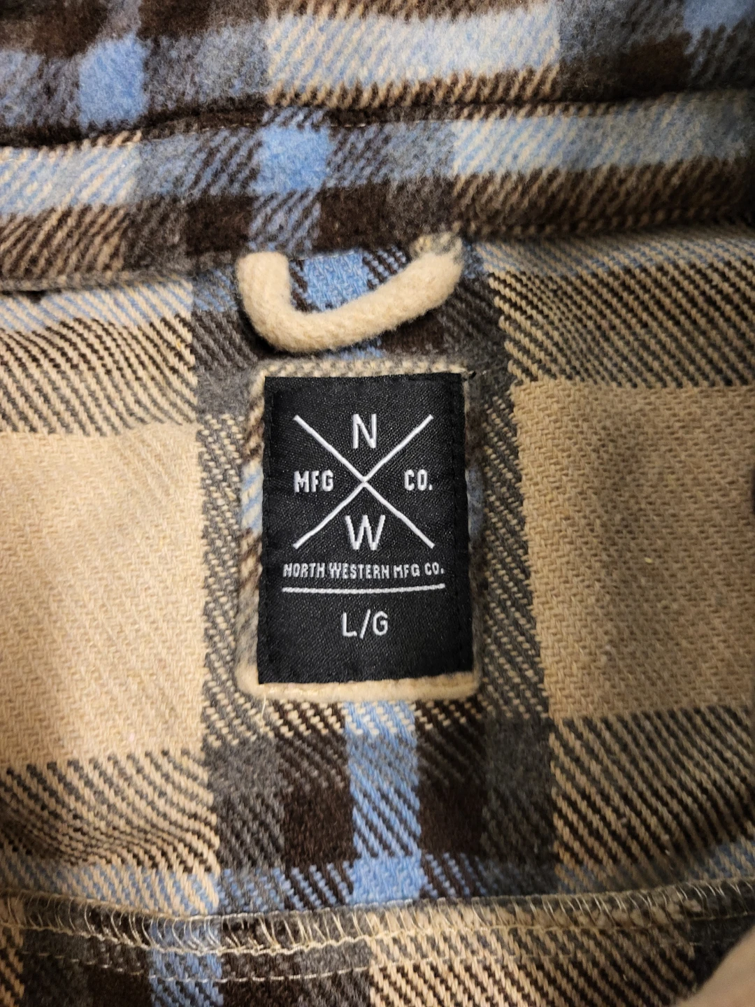 Cozy flannel shirt from North Western MFG! It's a size large and features a classic plaid pattern in cream, brown, and blue. Perfect for layering during the cooler months!