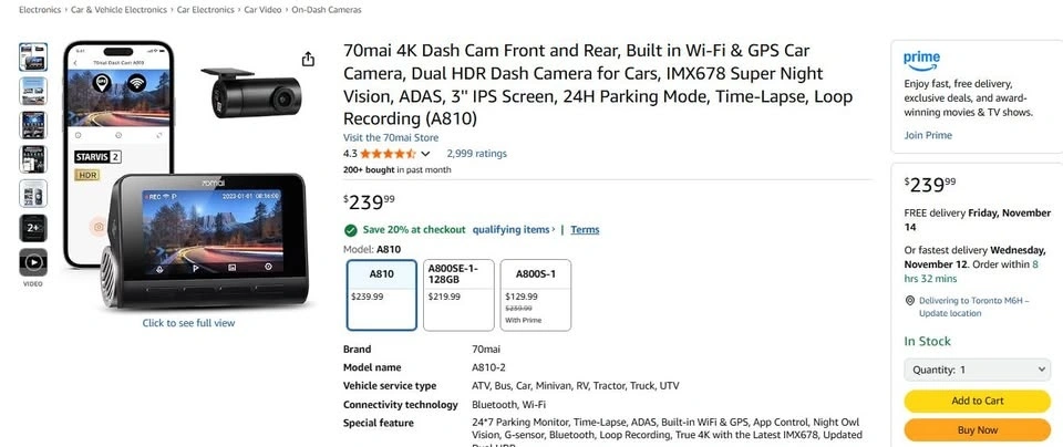 70mai 4K Dash Cam Front and Rear, Built in Wi-Fi & GPS Car Camera, Dual HDR Dash Camera for Cars, IMX678 Super Night Vision, ADAS, 3'' IPS Screen, 24H Parking Mode, Time-Lapse, Loop Recording (A810)