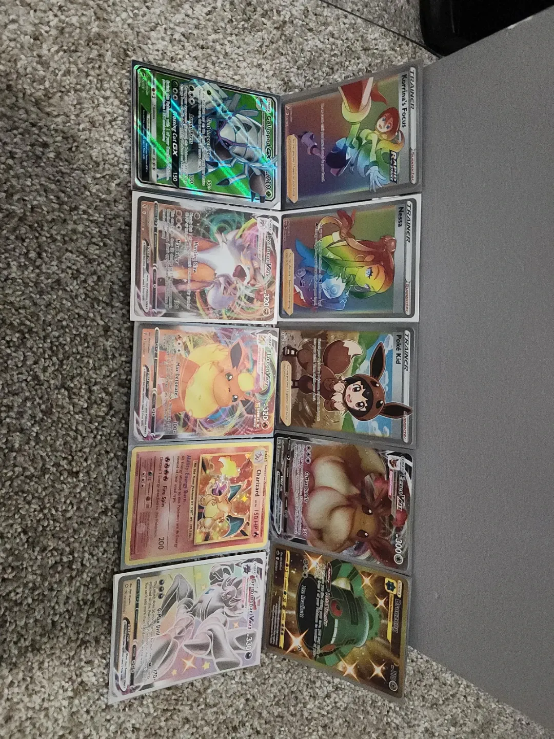 Selling a set of Pokemon Trainer cards! Includes Nessa, Poke Kid, Korrina's Focus, Eevee VMAX, etc. Great for any collector or player looking to add some cool cards to their collection. All kept in a case for a while. The charzard has a couple cracks nothing to major.