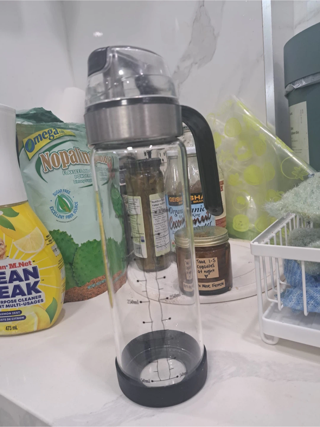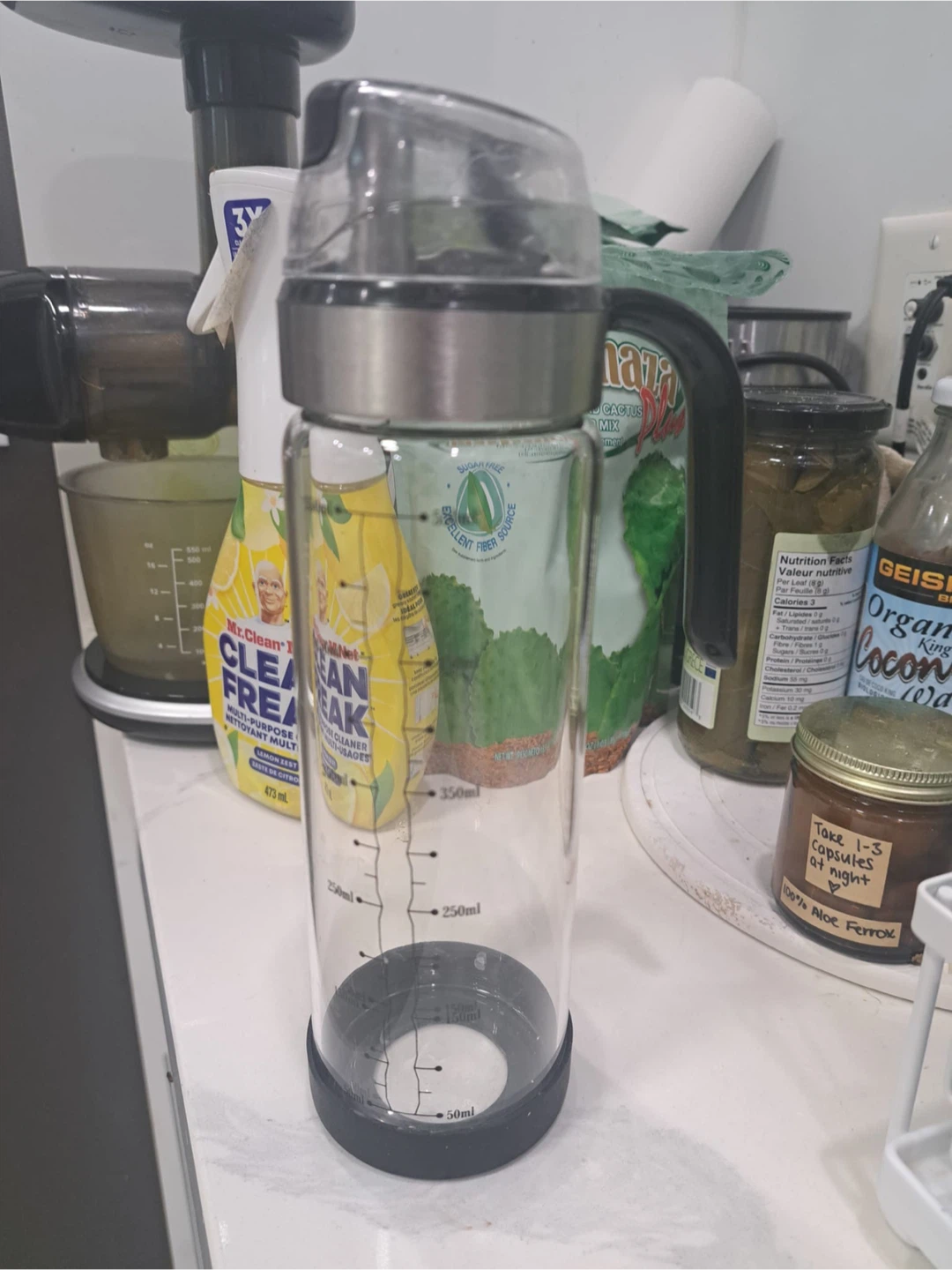Selling a ThinkSafe glass water bottle in excellent used condition! It has a capacity of 425ml, perfect for staying hydrated on the go. The bottle is made of glass and has a black base and a clear body with measurement markings. It's a great reusable option! Has only been used once for water. No issues, just no longer need it as I have another one that I use.