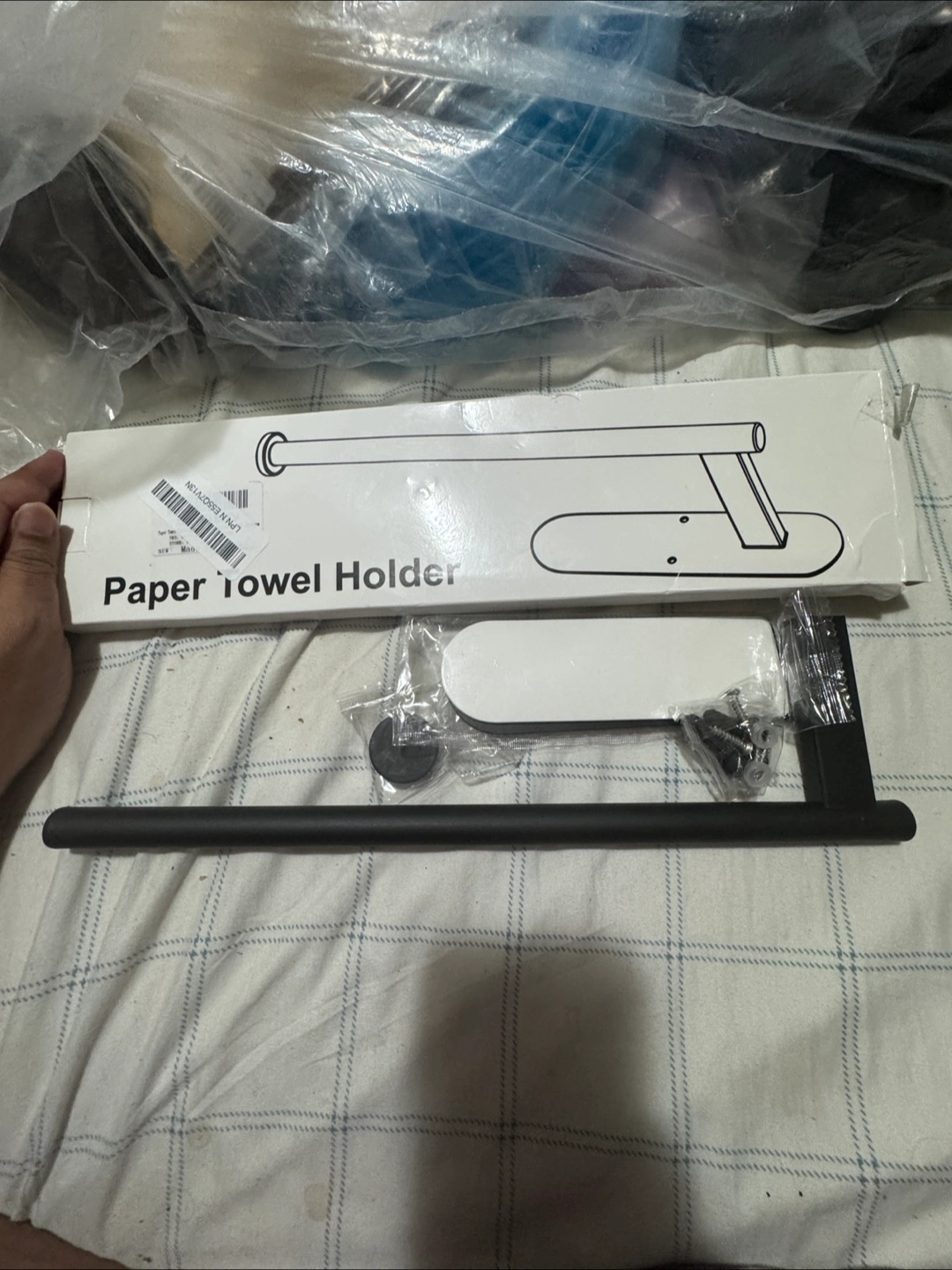 Selling a paper towel holder in black. It comes with all the attachments for smooth or rough wall surfaces. Perfect for your kitchen or bathroom!