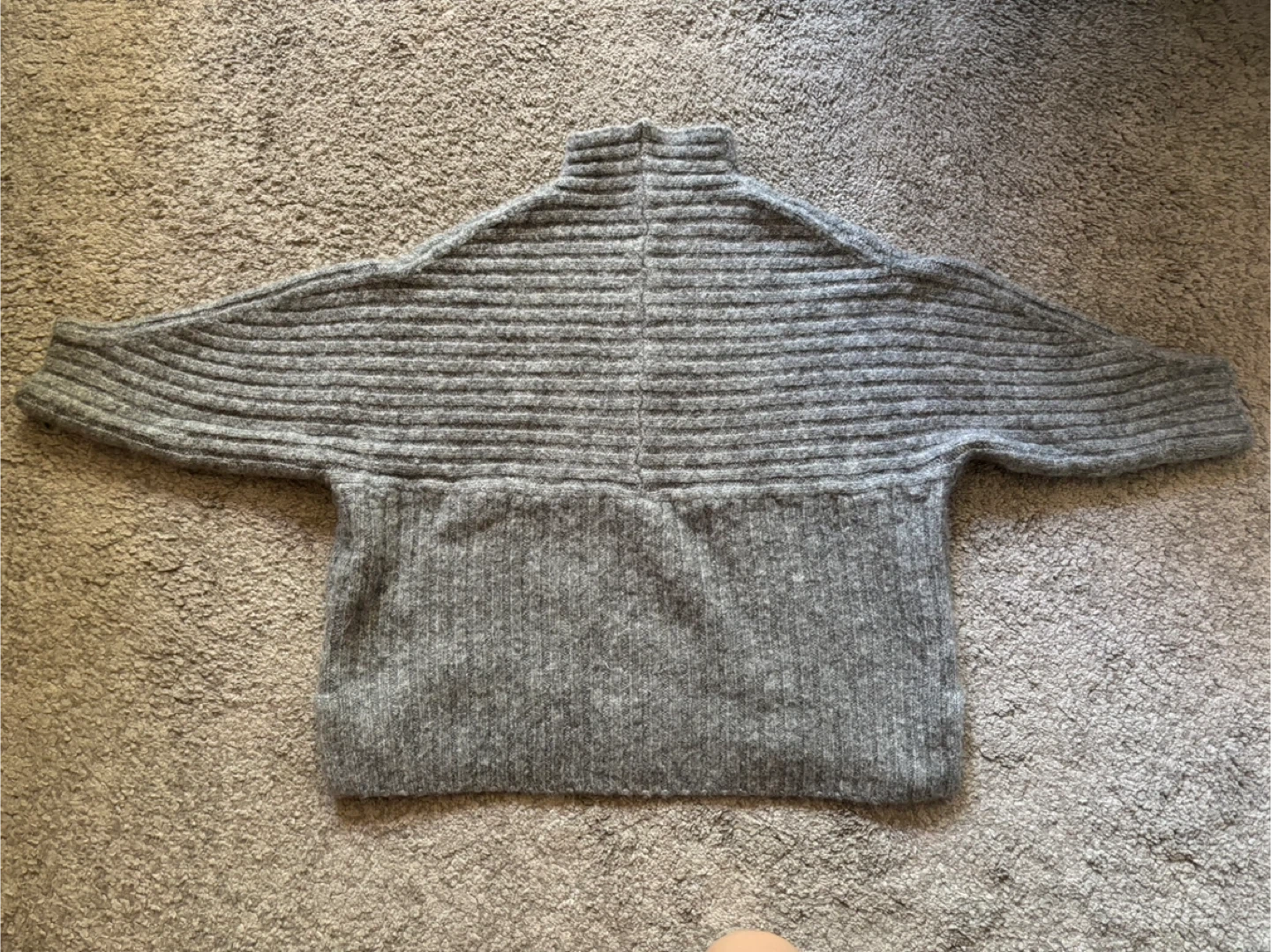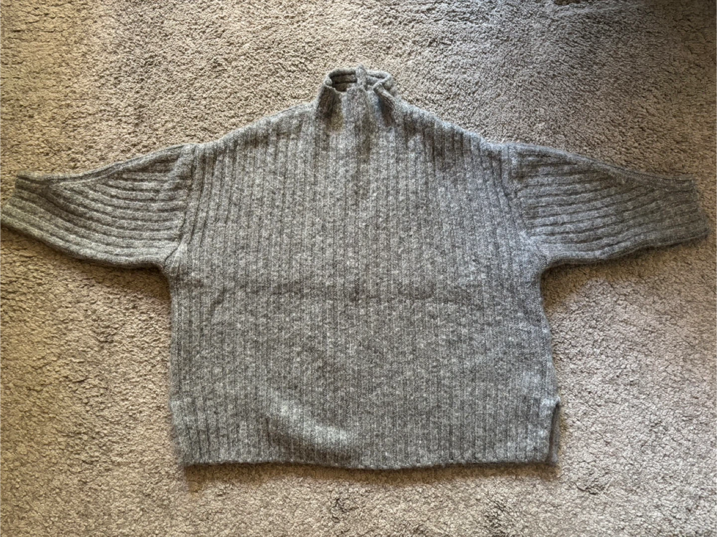Cozy grey sweater in a wool blend material. It has a unique ribbed design and a comfortable fit. Perfect for staying warm on chilly days!