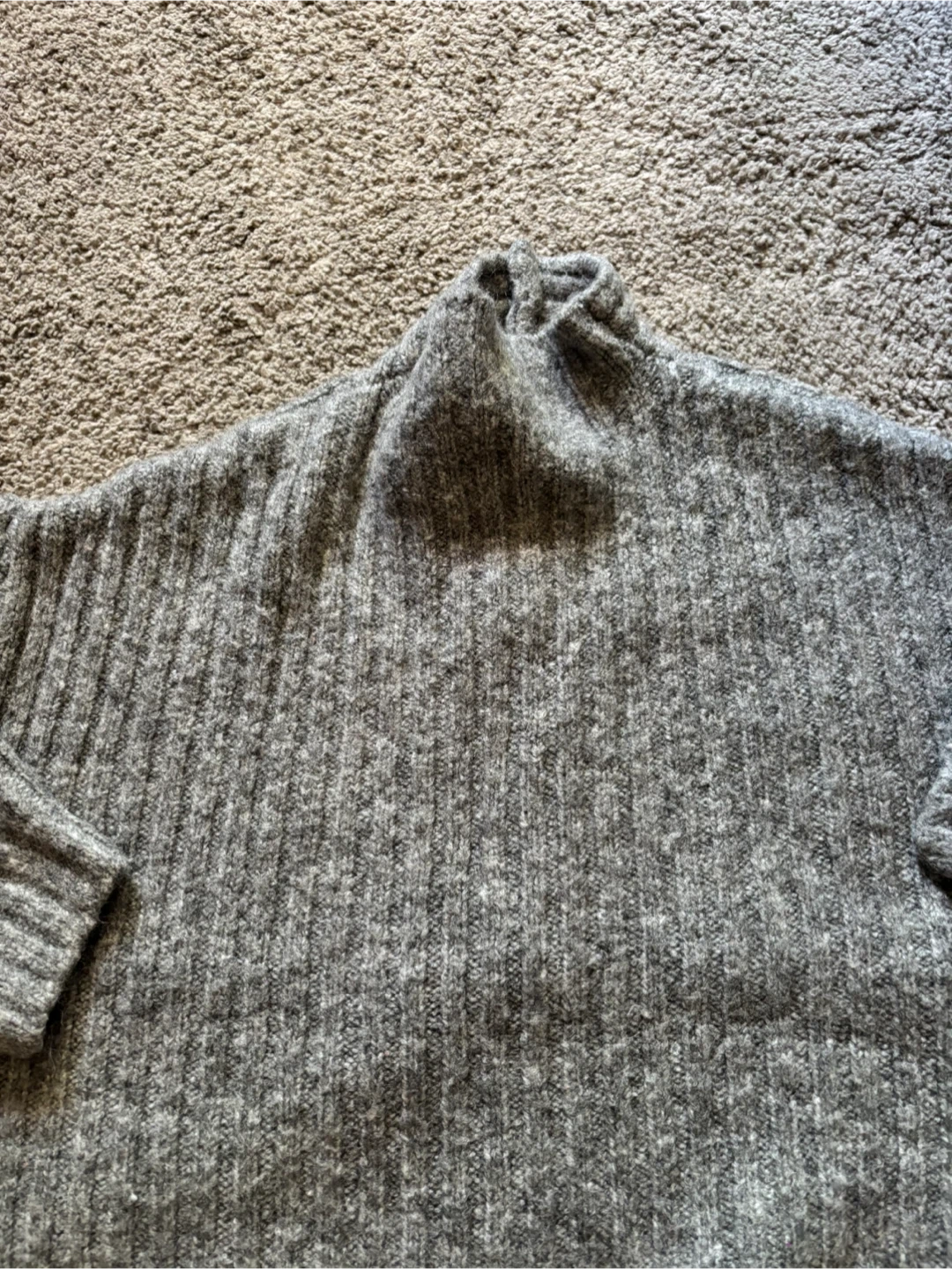 Cozy grey sweater in a wool blend material. It has a unique ribbed design and a comfortable fit. Perfect for staying warm on chilly days!