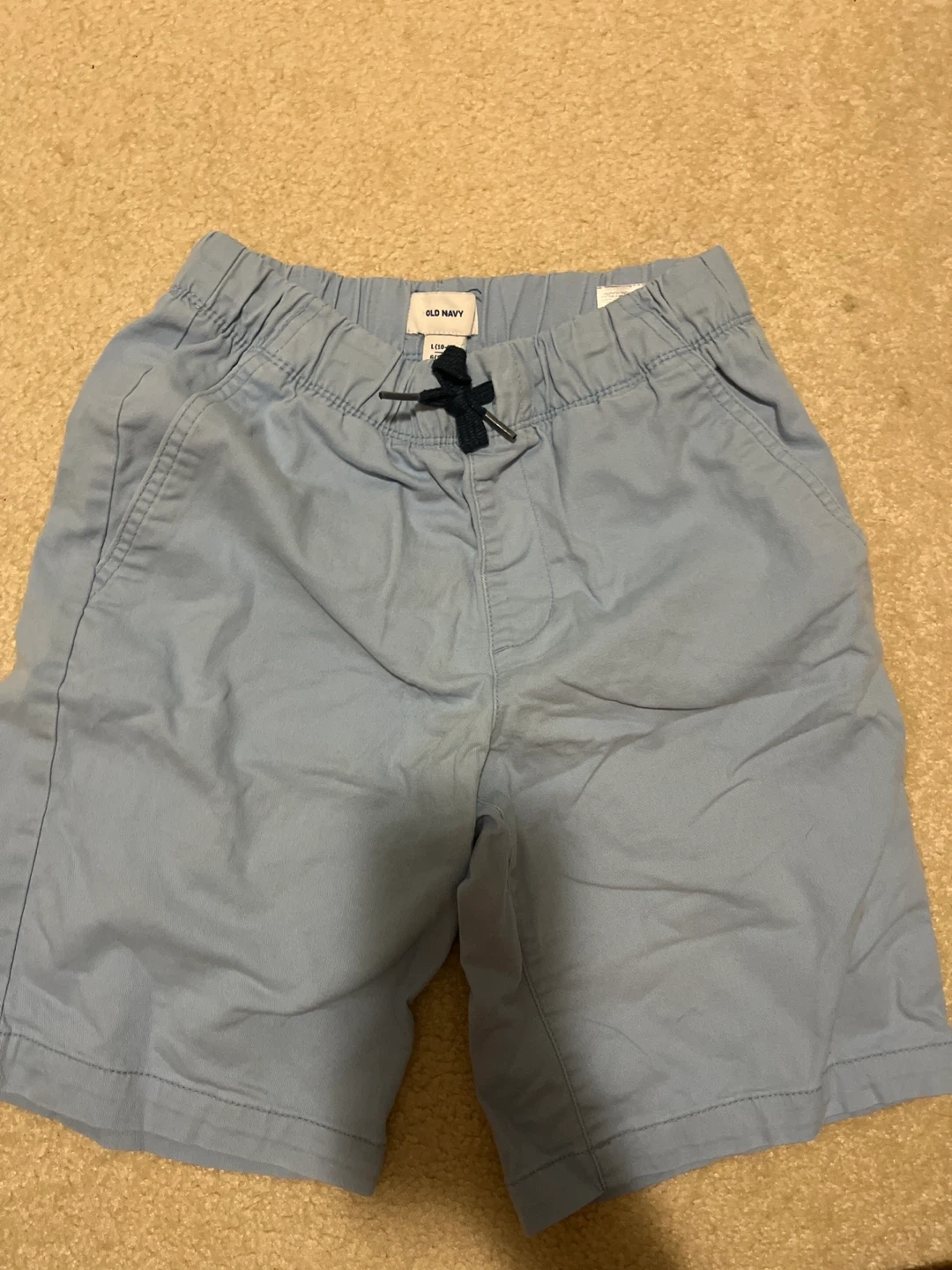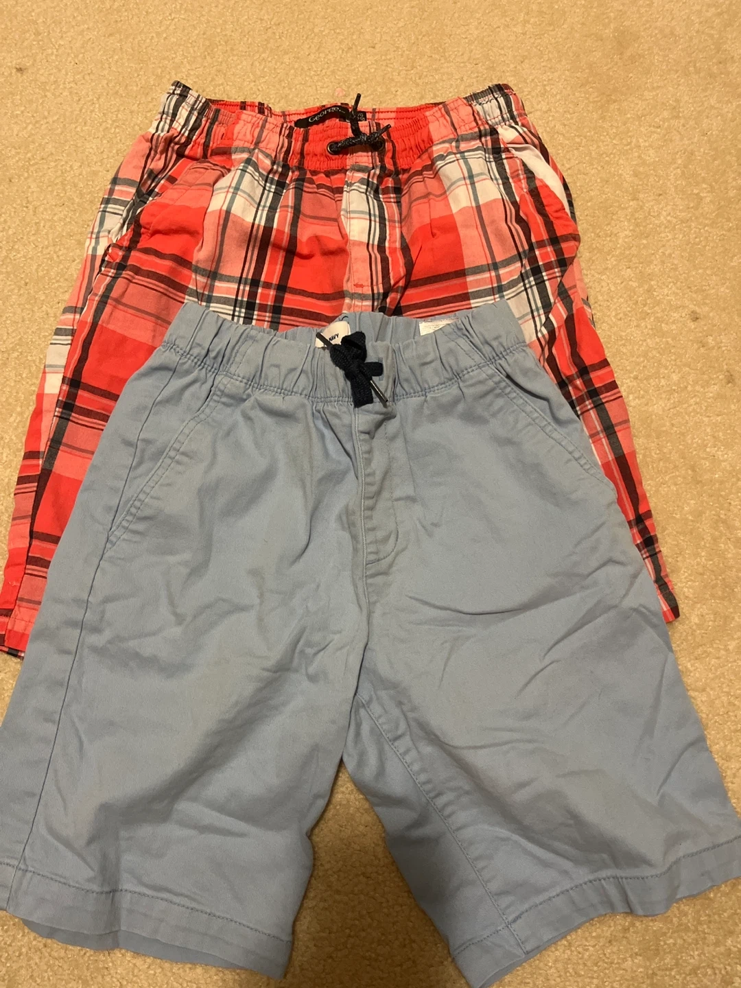 Two pairs of shorts for your little one! One pair is from Old Navy and is a light blue colour. The other pair is from George and is a red, white, and blue plaid pattern.