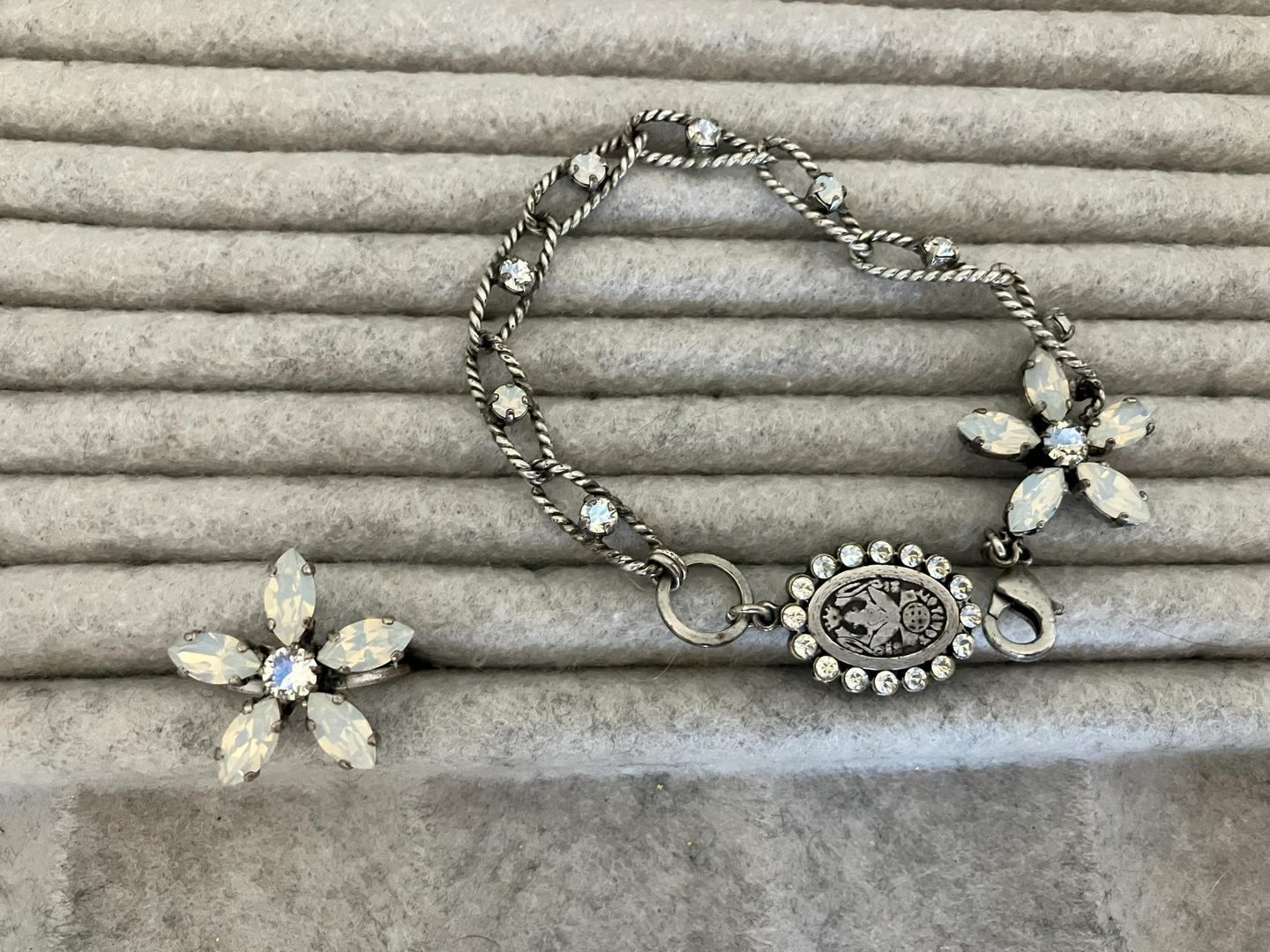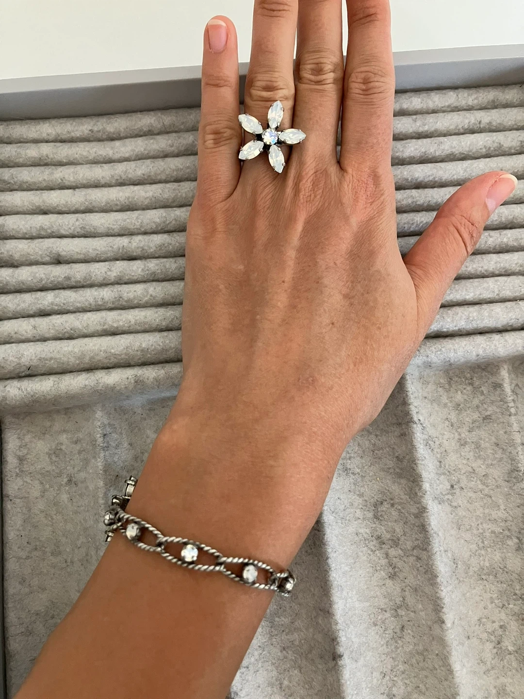 This elegant silver floral ring adds a touch of sophistication to any outfit. Perfect for special occasions or everyday wear. Brand new from designer Konplott, which uses Swarovski crystals. Ring is adjustable.