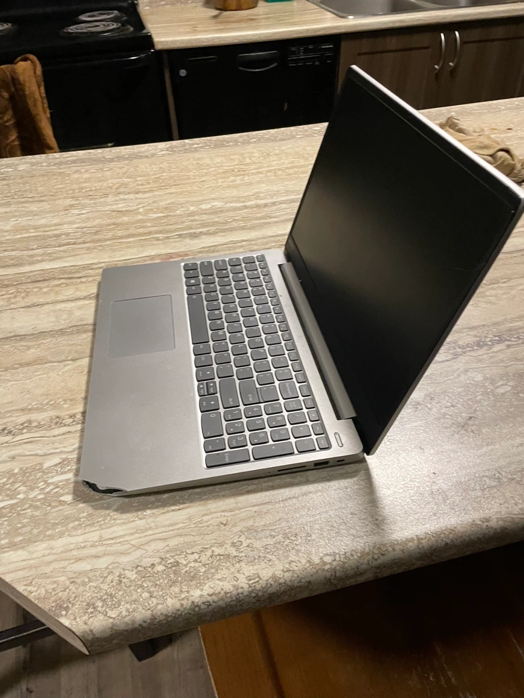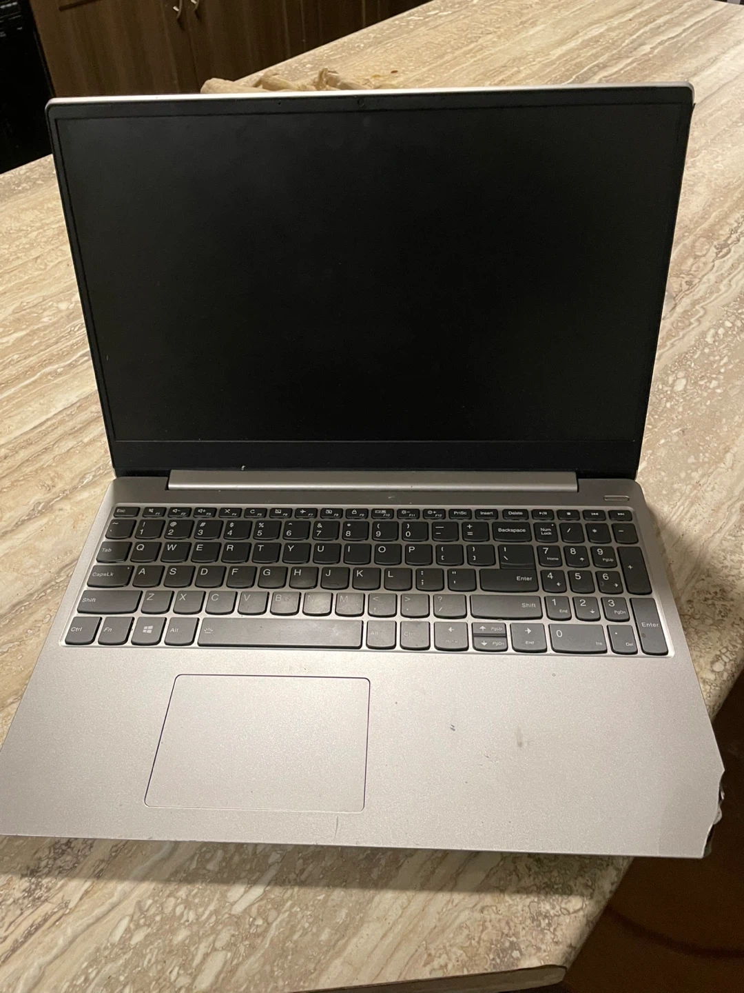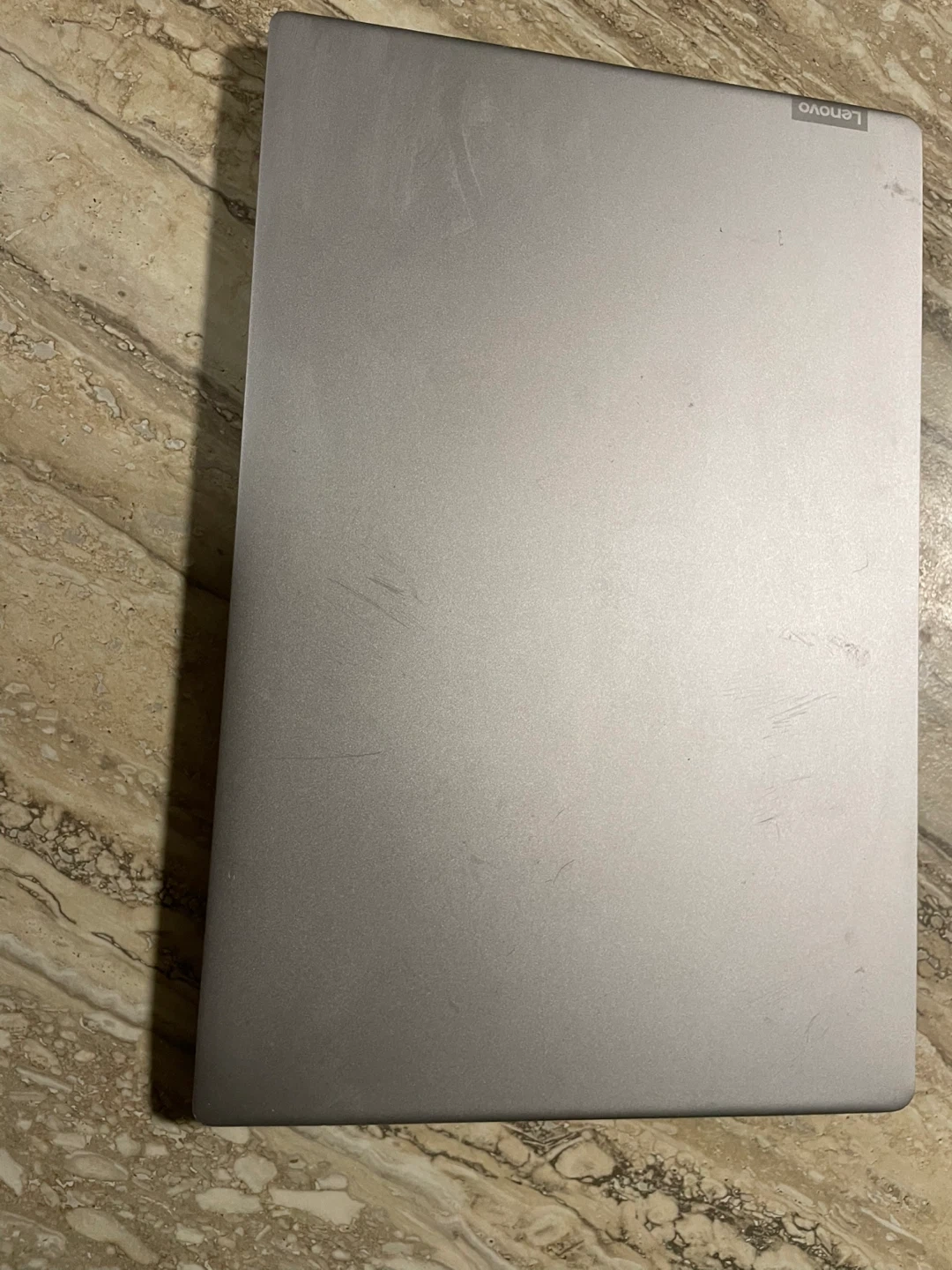 Selling a Lenovo laptop in silver. It has some scratches on the cover and a small crack on the bottom right corner. Still works great!