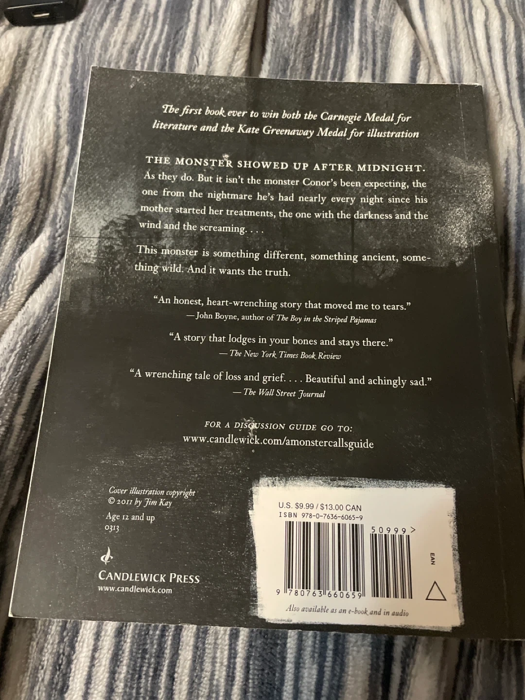 Selling the book 'A Monster Calls' by Patrick Ness! It's a novel with illustrations by Jim Kay. The cover mentions it's soon to be a major motion picture. It's a story for ages 12 and up!