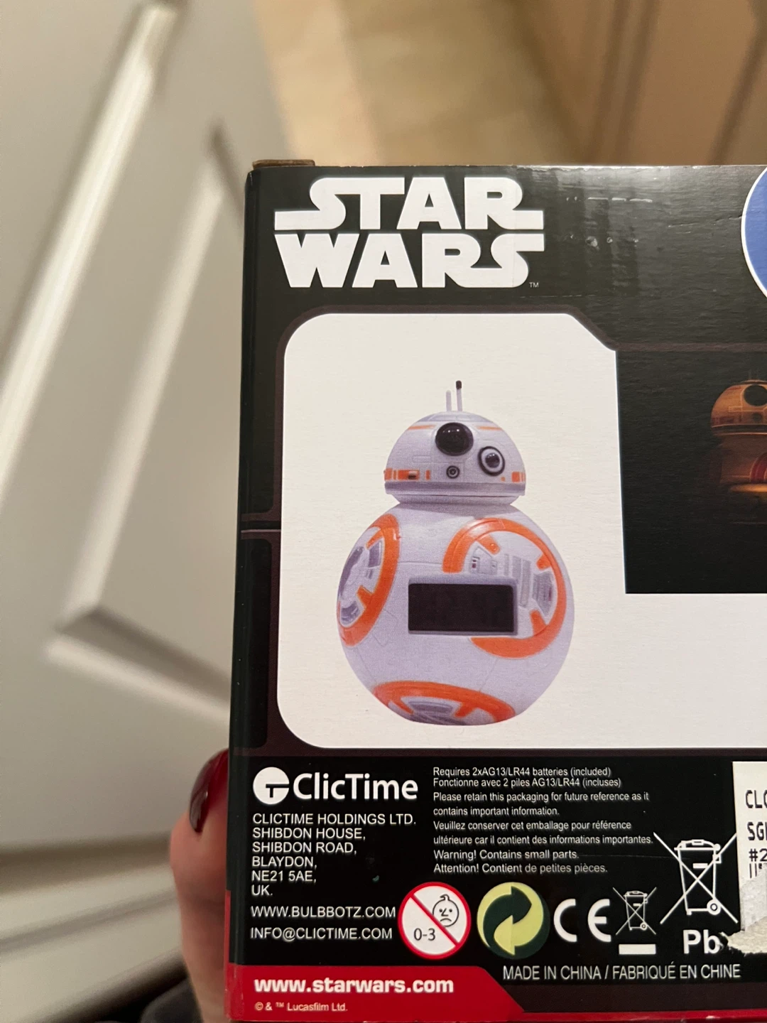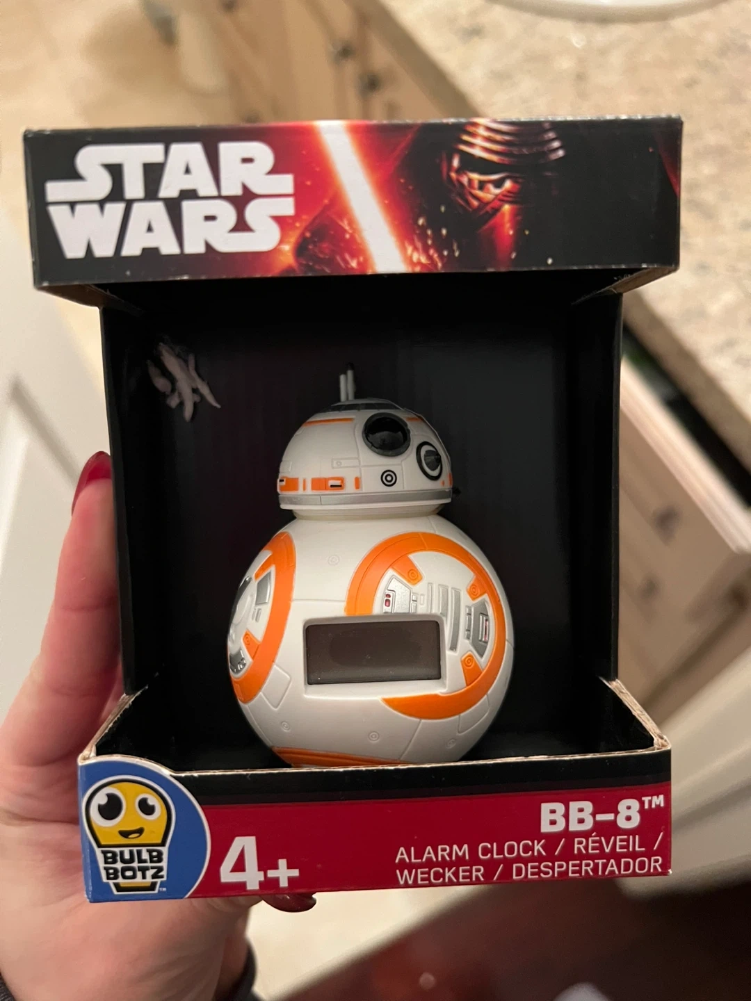 Selling a brand new Star Wars BB-8 alarm clock! It's still in its original box and ready to go. Requires 2xAG13/LR44 batteries (included). Recommended for ages 4+