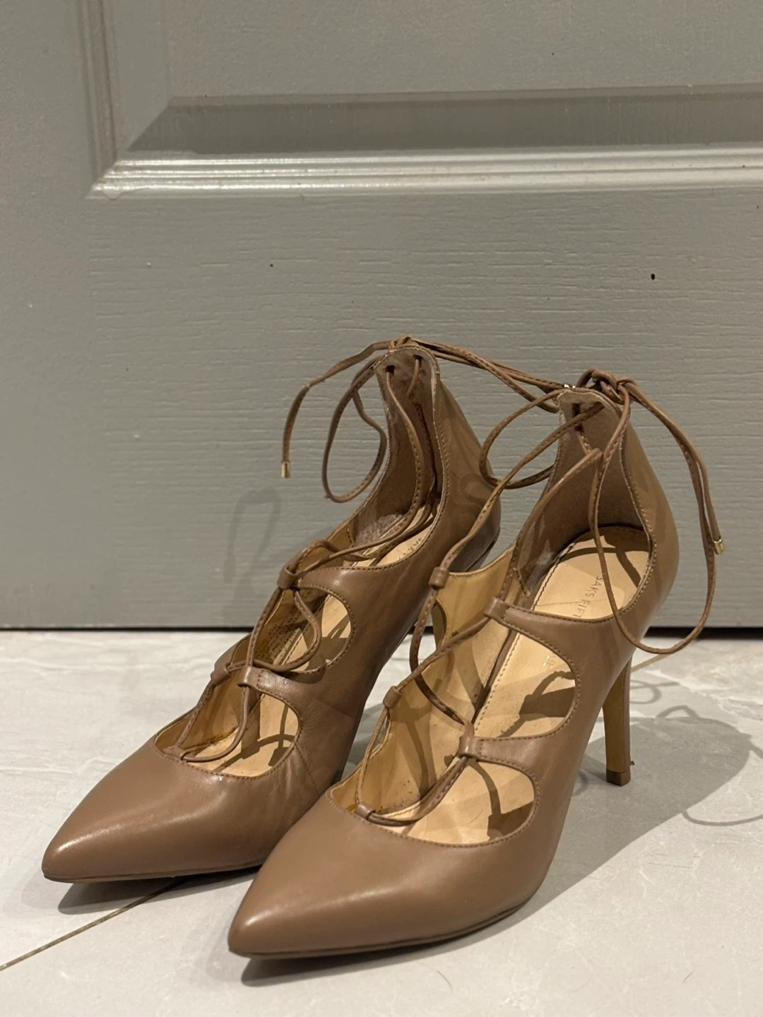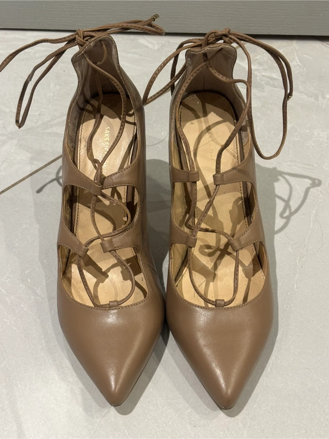 These are a pair of stylish lace-up heels from Saks Fifth Avenue. They feature a unique design and are in great condition. Perfect for adding a touch of elegance to any outfit!